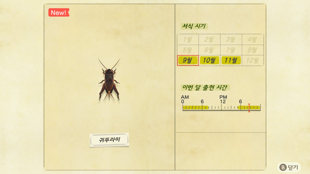 이번 9월달만 등장하는 곤충들은 없습니다. 그리고 대부분 봄에도 한번씩 등장했던 벌레들이라 이미 잡으신 분들도 계실꺼에요. 9월부터만 보이는 벌레로는 왕나비, 귀뚜라미, 방울벌레, 고추잠자리 총 4종류입니다. 딱히 판매가격이 높지 않은터라, 곤충채집대회용이나 수집용 정도로 모으시면 될것 같네요. 편하게 즐기시면 되실것 같습니다.