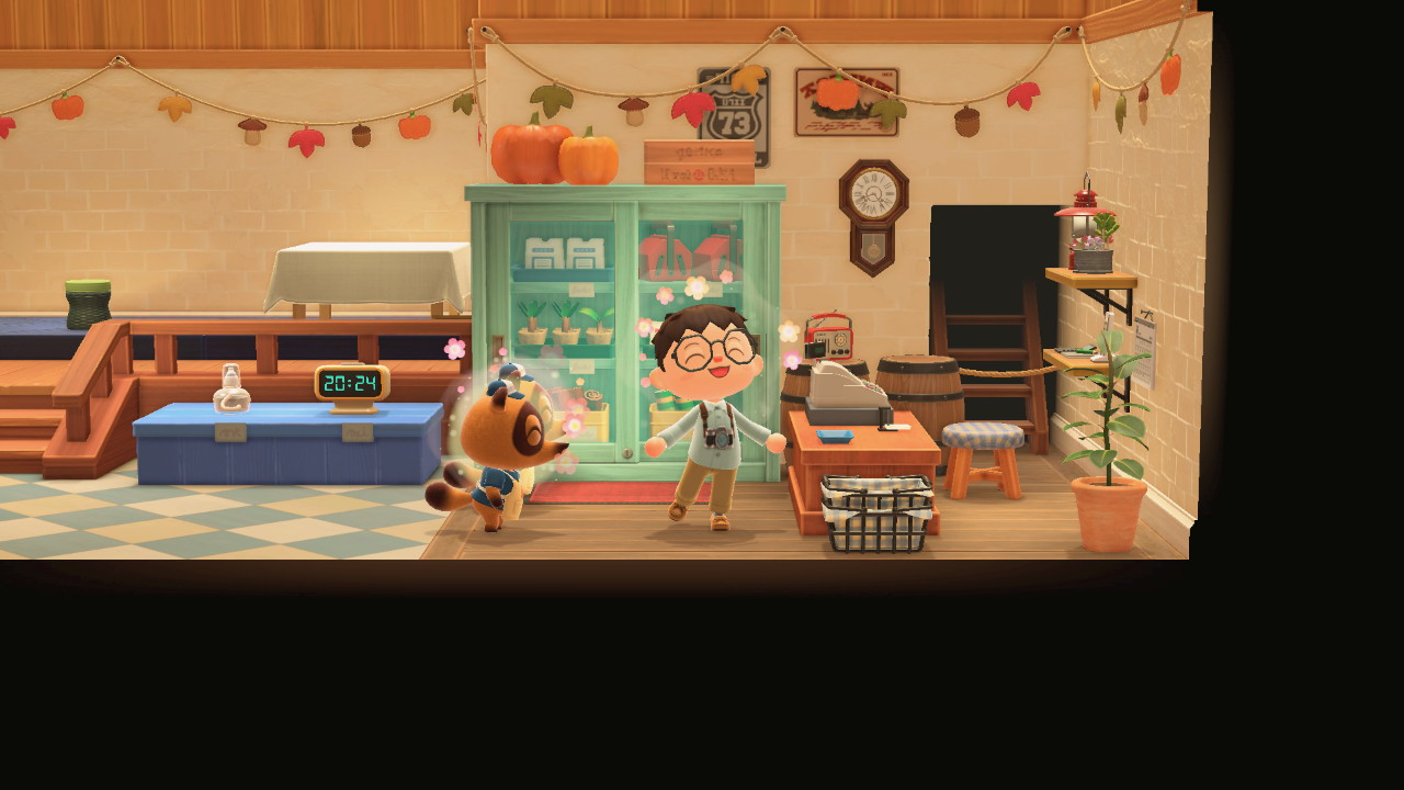 - 너굴상점과 옷가게도 가을맞이로 변화되었습니다. 너굴상점 밖에는 호박들과 단풍잎으로 데코레이션을 해서 가을가을한 느낌을 벌써부터 주고 있네요. 매장 내 인테리어도 호박이 올려져있고, 가랜드도 단풍잎, 도토리로 꾸며져서 신기하고 이쁘네요. 아! 참고로 이제 여름 아이템은 다 빠졌어요. 서핑보드나 선풍기는 이제 구입이 불가합니다.