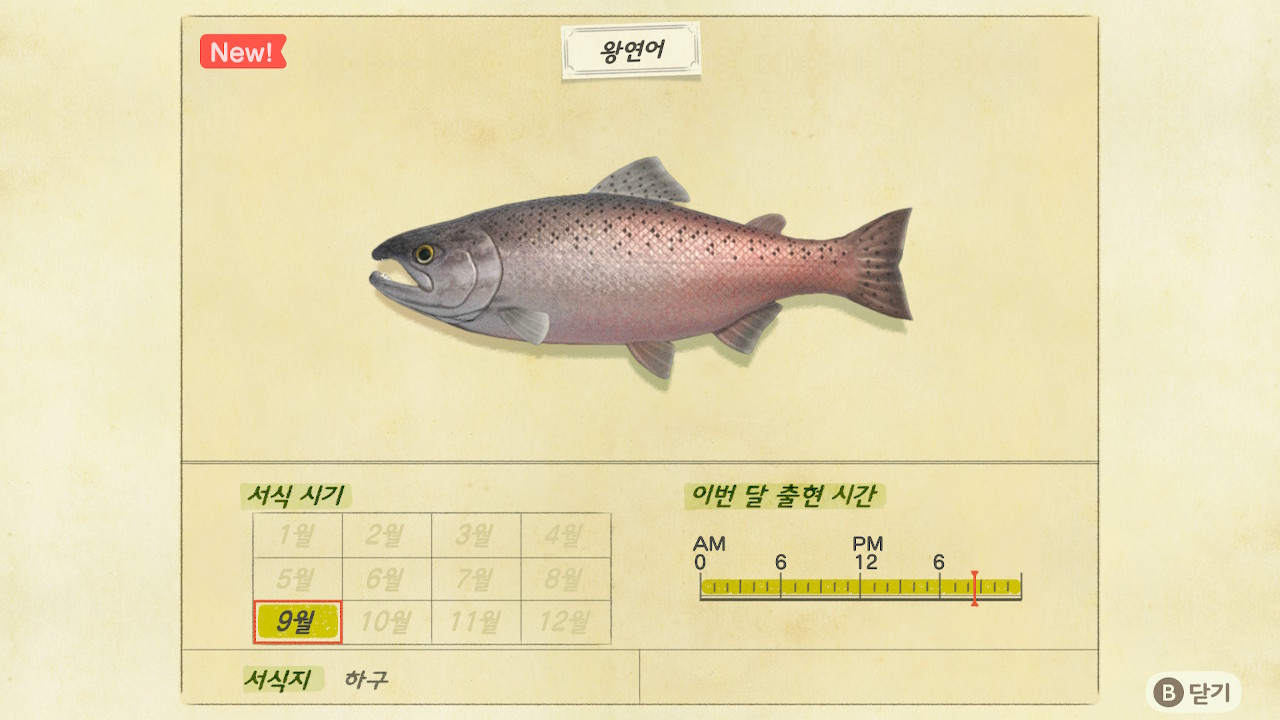 - 총 8마리의 새로운 물고기를 9월달 부터 만날 수 있어요! 이 중에 연어, 왕연어 두 종류는 9월만 잡을 수 있으니!! 미리 잡아두세요! 전부 민물고기로 바닷물고기는 없으니 강가나 절벽을 노리시면 될것 같습니다.