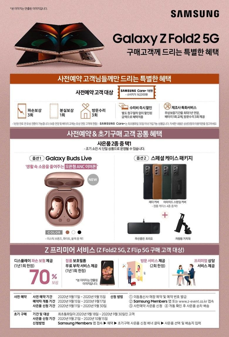 갤럭시Z 폴드2는 5G 모델로 출시되며, 9/18(금) 우리가 이미 알고있는 갤럭시 플립의 5G 모델과 동시 출시된다고 하네요. 그리고, 사전예약을 통해서는 빵빵한 혜택과 사은품을 증정(위에 사진을 참고해 주세요) 한다고 하니 기다리셨던 분들은 사전예약을 하시는게 좋을 것 같습니다.