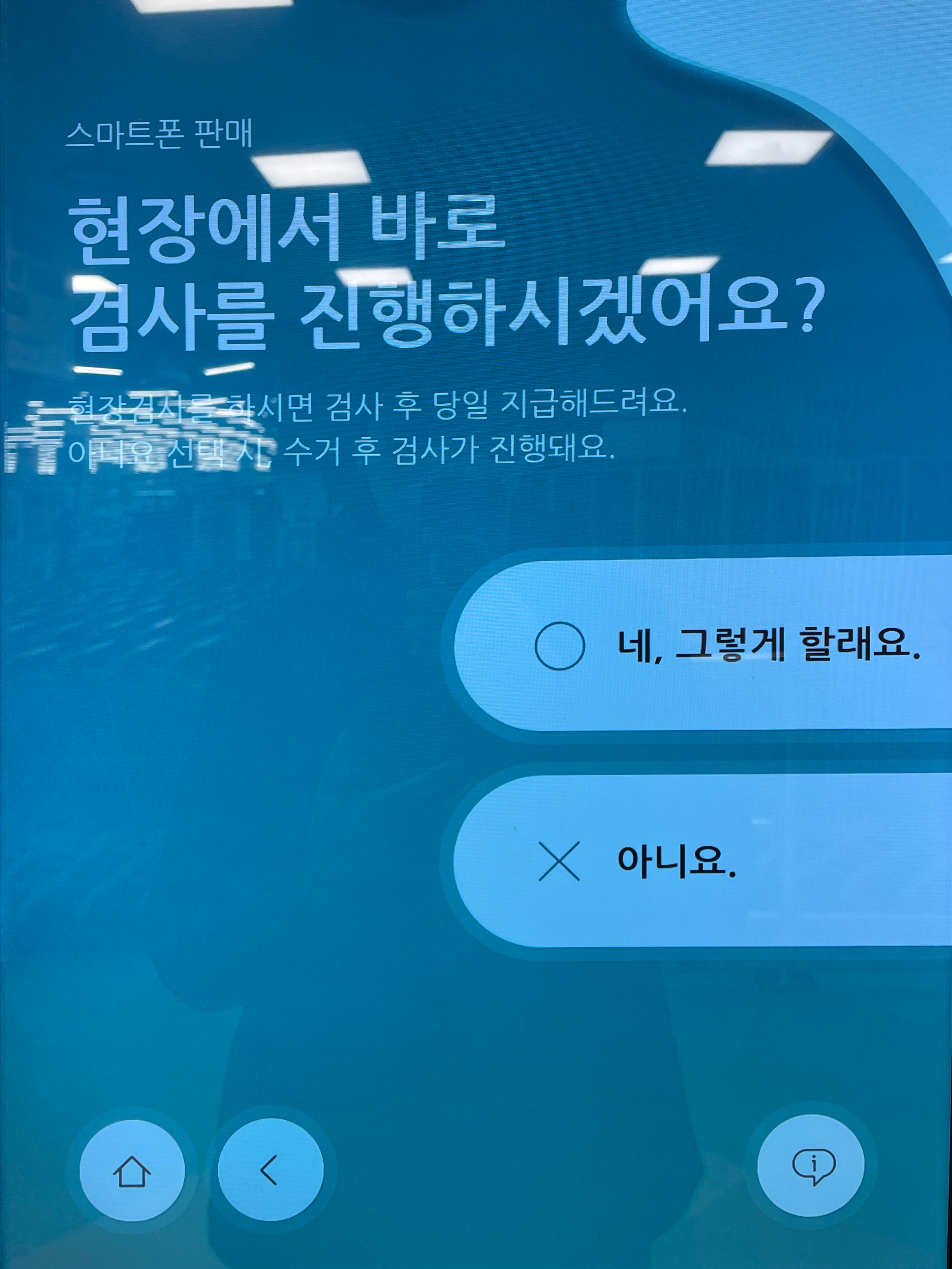 먼저 본인인증을 받을 핸드폰 번호를 입력하면, 카톡으로 인증문자가 나옵니다. 그 인증을 마치시고 판매할 휴대폰이 스마트폰인지 체크를 하고 현장 검사를 받을지 확인을 하는데요. 최근 판매되고있는 아이폰이나 갤럭시와 같은 폰들은 그냥 판매가 가능하고, 오래된 기종이나 해외폰들은 현장검사가 불가하다고 하네요. 물론 이경우도 판매가 아예 안되는것이 아니라 수거 후 검사가 진행된다고 합니다.