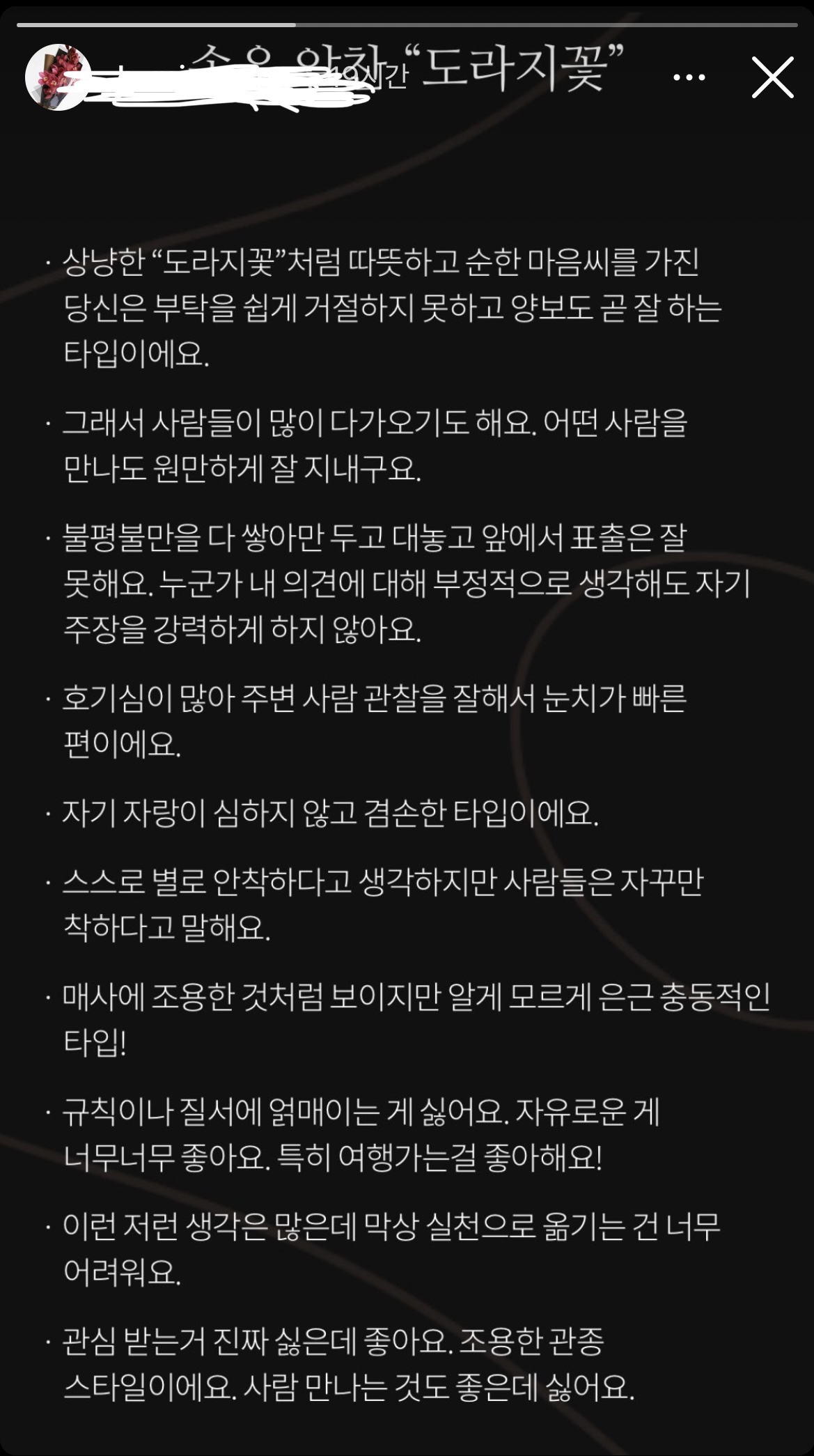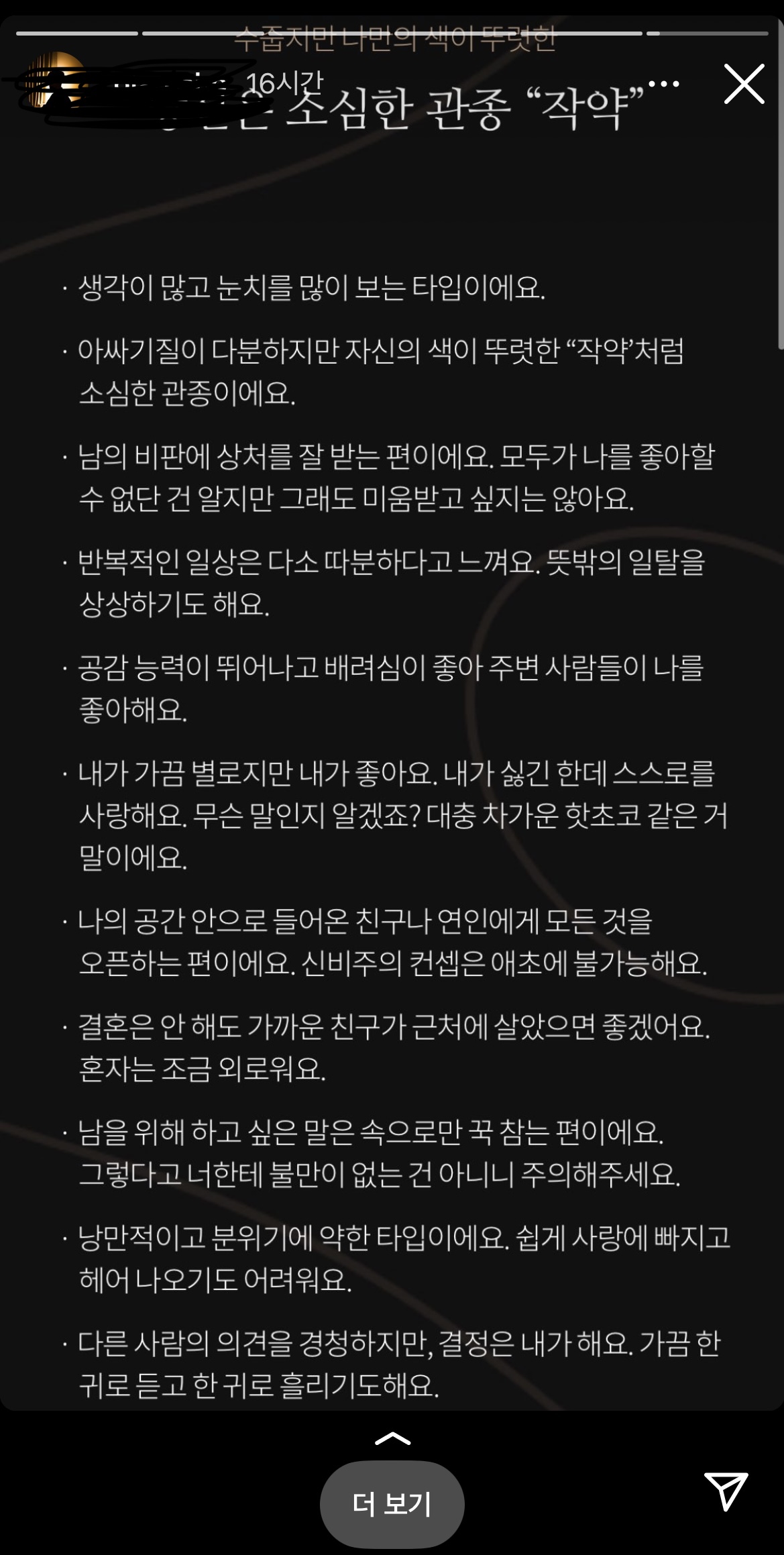 - 이미 지인들 인스타그램 보닌까 서로 자기결과 공유하느라 바쁘더라구요. 저도 올리긴 했는데, 주변 친구분들이나 만나지 못했지만 알고잇는 인스타 지인들의 성격을 간접적으로 알수 있어서 재미있었습니다. 나랑 잘 맞는 친구나 지인이 있는지 함께 찾아보시면 재미있을것 같아요.