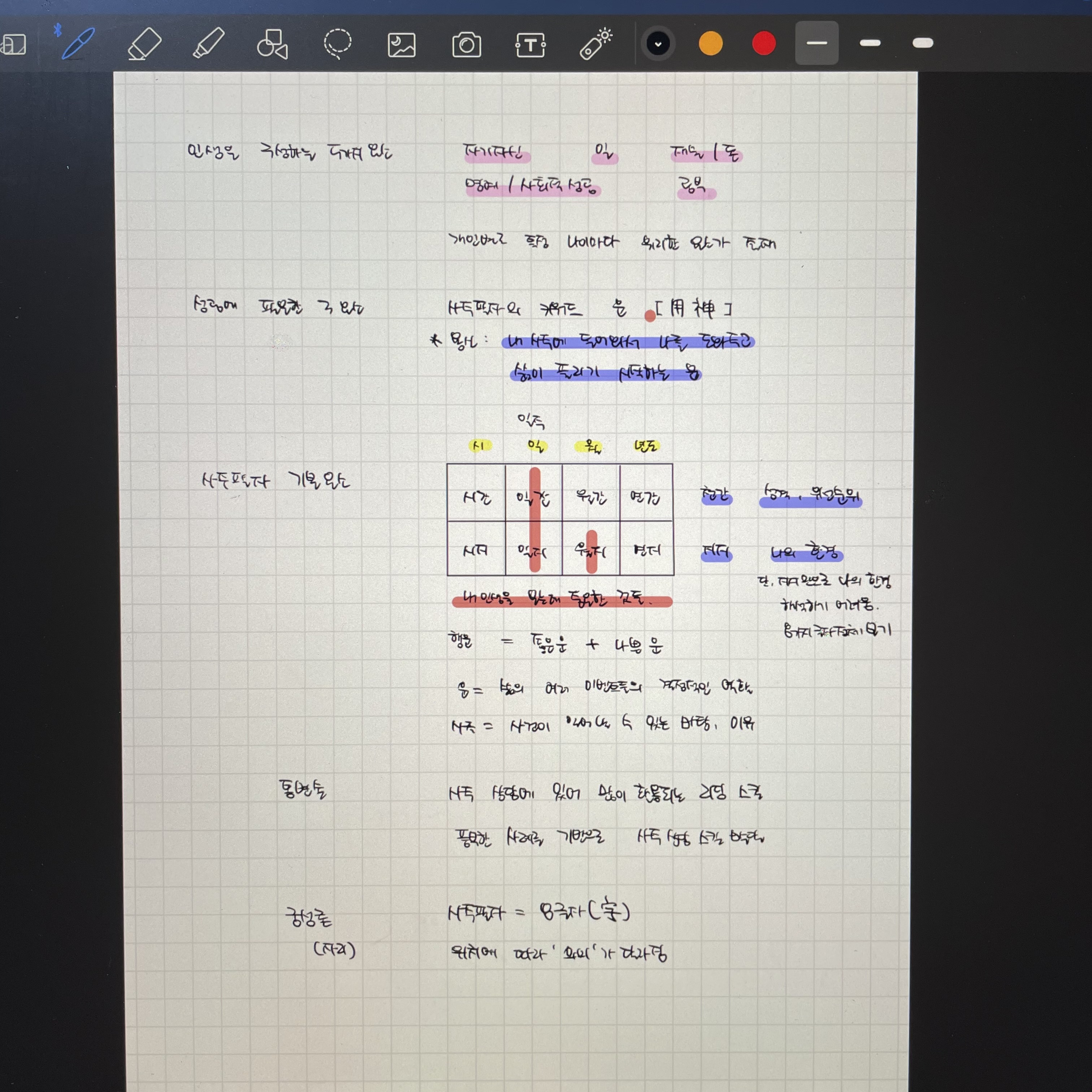 강의를 듣다보면, 필기할 거리가 정말 많습니다. 그래서 저는 아이패드로 강의를 들으면서 필기를 해두었는데요. 이걸 폰에도 옮겨서 틈틈히 복습하면서 보고 있습니다. 그러다보니 강의를 하나하나 보고 또 보고 할때마다 내가 여태까지 생각하고 행동했던 것들이 제 사주와 많이 닮아서 놀랬습니다.