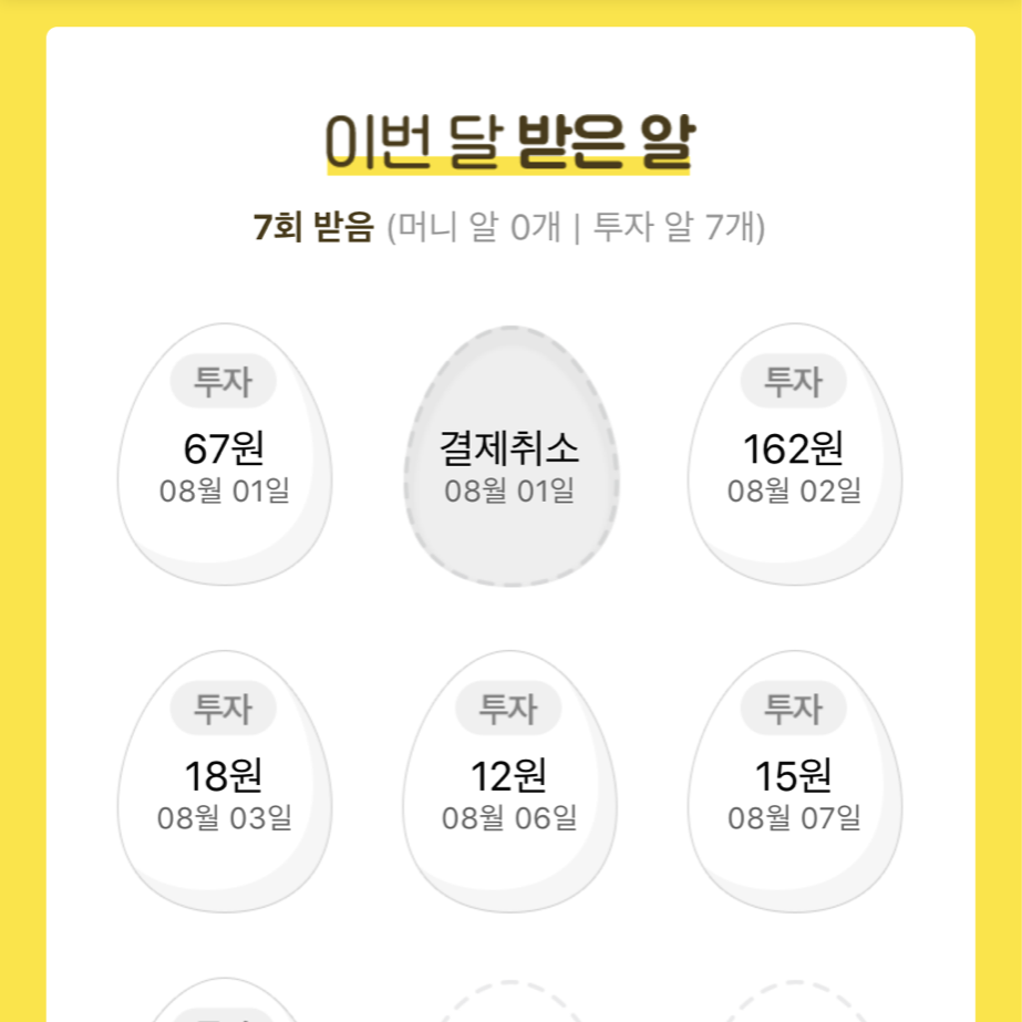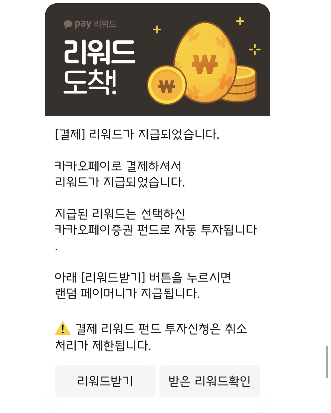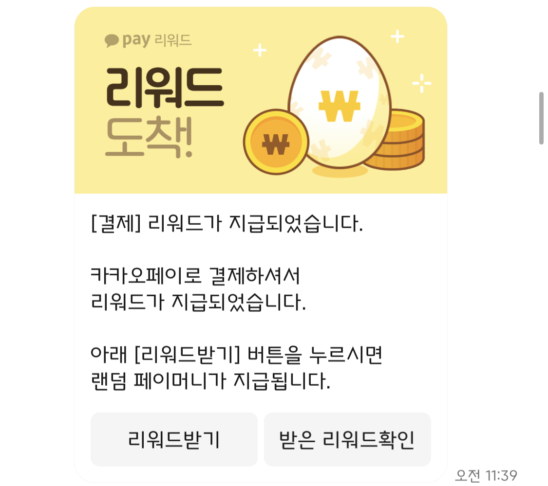카카오페이로 결제(온/오프라인 둘다 가능)를 하면, 리워드라고 해서 알을 받을 수 있습니다.