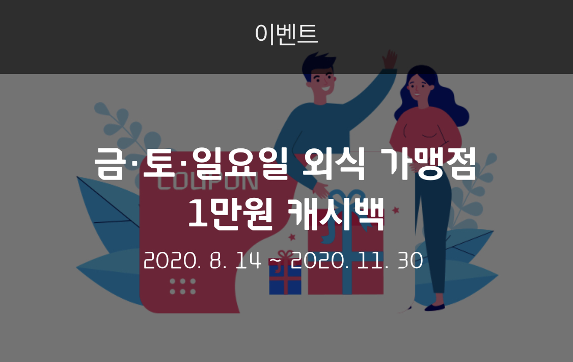 - 2020년 11월 30일까지 금~일 (또는 공휴일 포함) 외식 가맹점에서 6회 이상 이용시 1만원 캐시백 됩니다.