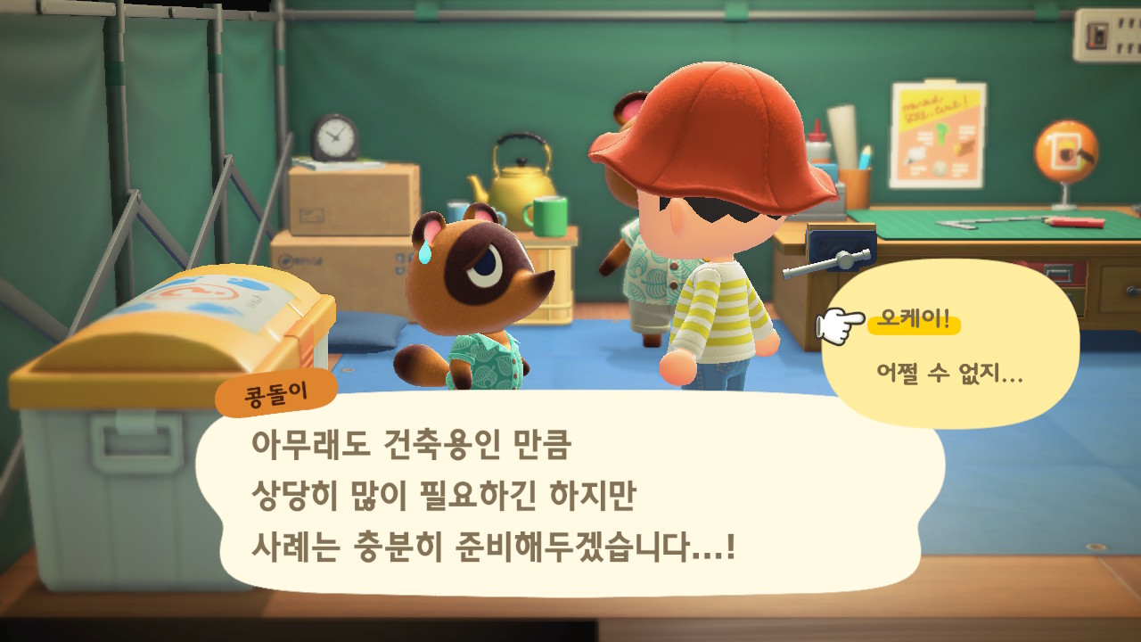 모동숲도 모든 가게들이 기본적으로 공사가 들어가서 하루가 걸리기 때문에 미리미리 해두는것이 좋죠