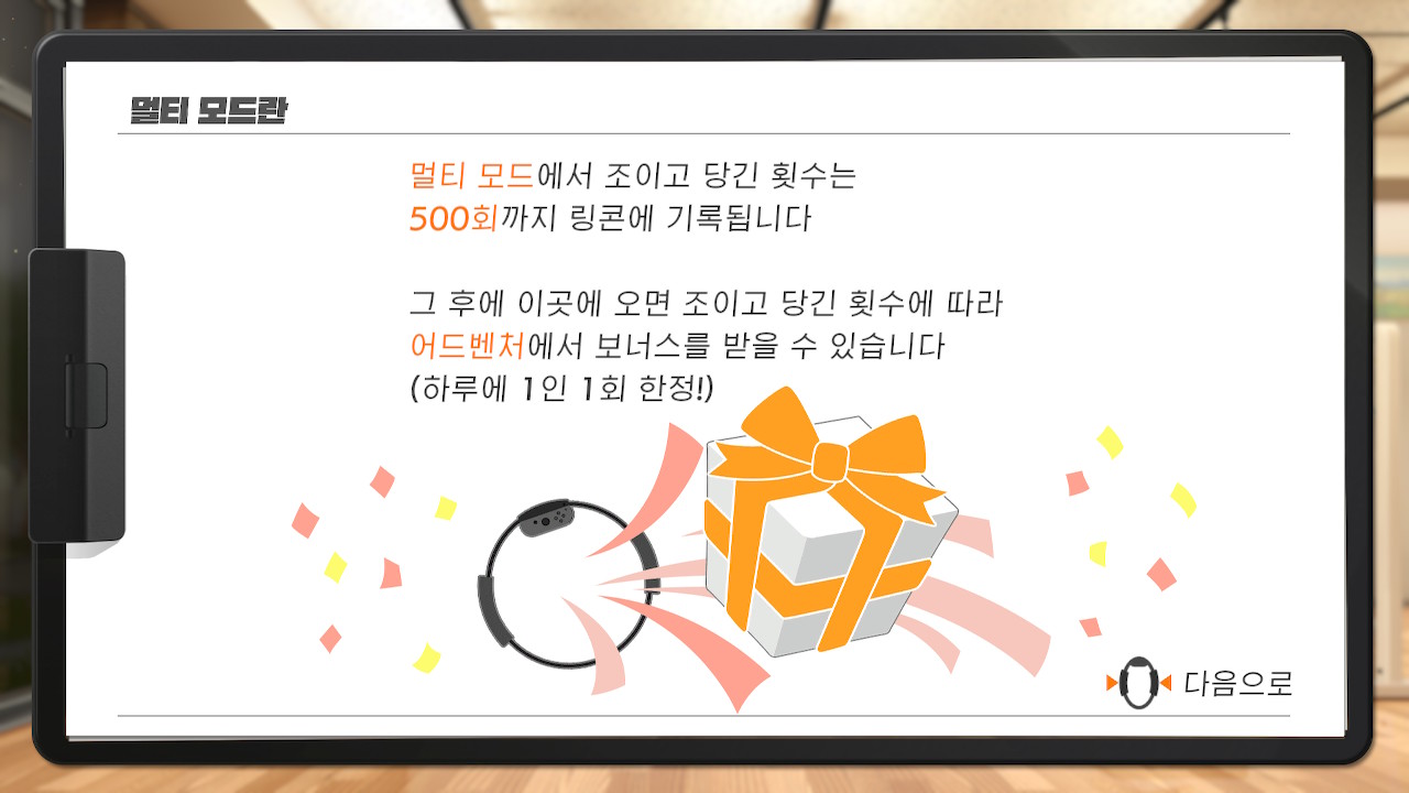처음에 소개드린대로 이 게임은 필라테스의 필라테스링을 응용한 게임으로 필라테스링을 사용하는 필라테스의 모든 동작을 실제로 다 할 수 있습니다. (모양 자체가 필라테스링하고 동일하고 거기에 조이콘을 부착한거닌까요 ㅎㅎ) 그러므로 별도의 게임없이 필라테스링을 안으로 조이거나 밖으로 땡기거나 하면서 운동이 가능합니다.