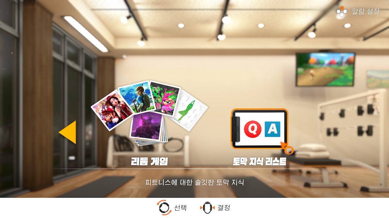 말그대로 내가 하고 싶은 운동을 맘대로 조합하여 할 수 있는 모드입니다. 물론 링피트에서 추천하는 운동이나 단련하고 싶은 부위를 선택하면 그 부위에 맞는 운동을 추천하는 큐레이션 기능도 있어서, 초보분들도 사용을 할 수 있는 기능입니다.