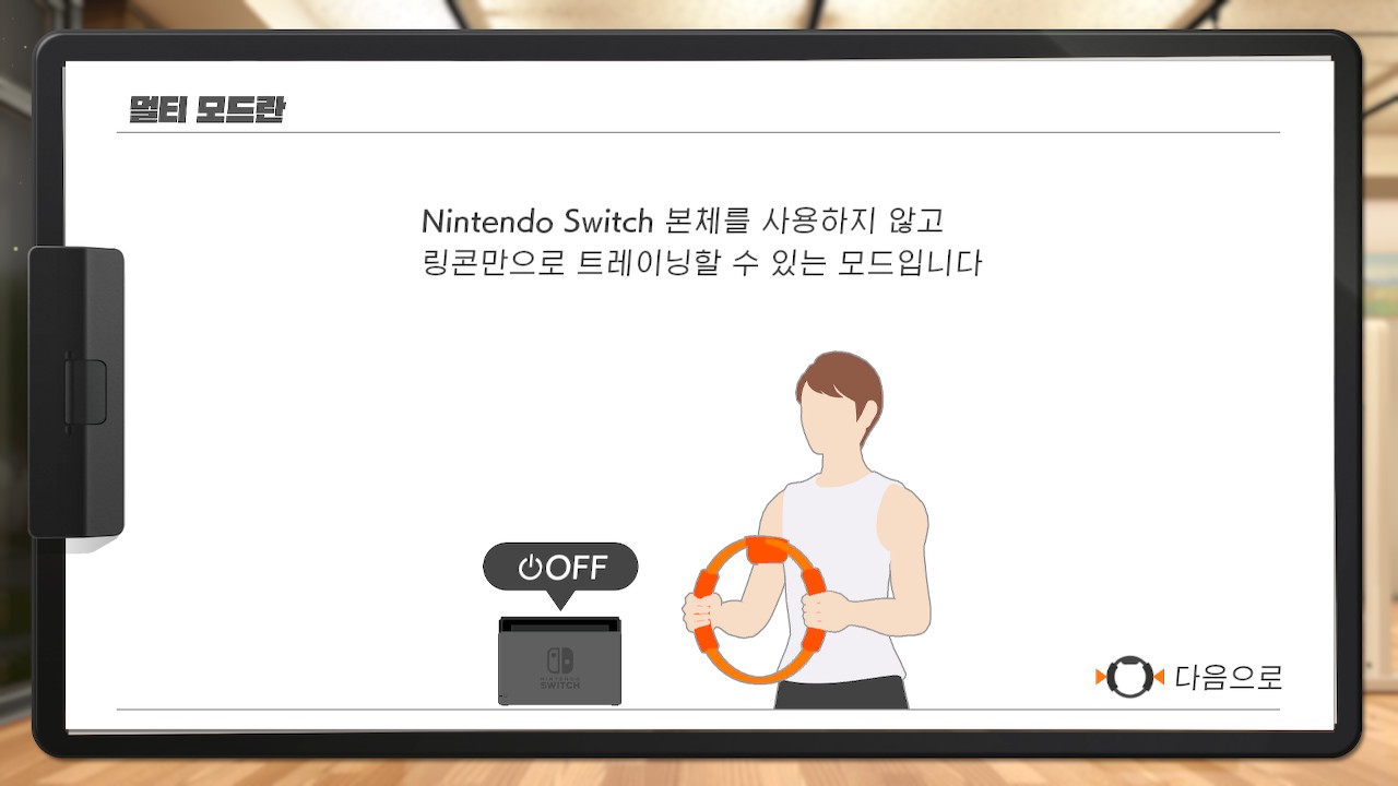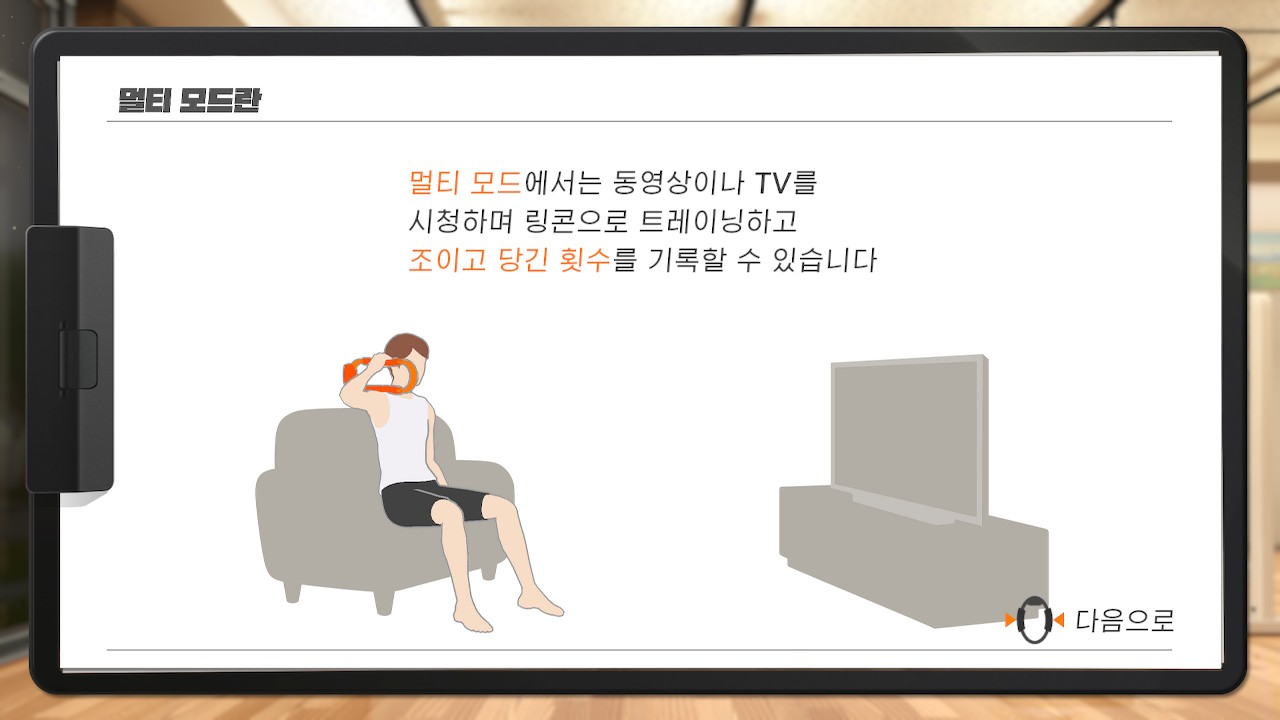 그중에 하나가 바로 멀티모드 입니다!! 나는 어드벤쳐 게임도 리듬게임도 싫어 그냥 내가 보고 싶은 티비 보면서 운동 하고싶다! 하시는 분들을 위한 모드 입니다. 링콘을 다양한 부위에 대고서 조이는 형식입니다.