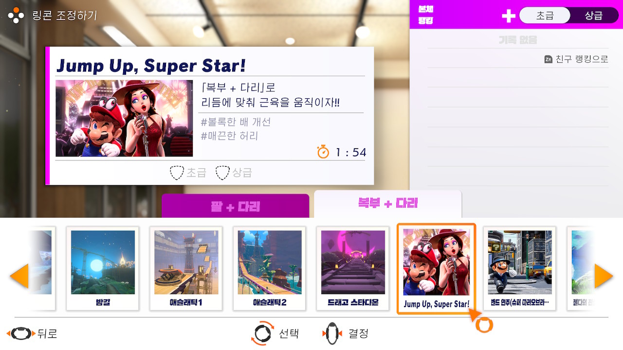 말그대로 내가 하고 싶은 운동을 맘대로 조합하여 할 수 있는 모드입니다. 물론 링피트에서 추천하는 운동이나 단련하고 싶은 부위를 선택하면 그 부위에 맞는 운동을 추천하는 큐레이션 기능도 있어서, 초보분들도 사용을 할 수 있는 기능입니다.