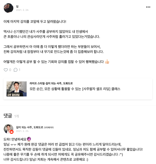 자세하겐 말 할수는 없지만, 제 사주를 보면서 깜짝깜짝 할때가 많았습니다. 그래서 더 공부를 하게 되고 각 챕터에 마지막 강의에 미션을 하면서 좀 더 나를 돌아보는 기회를 갖게됩니다. 그리고 댓글을 남기면 도화도르님이 정말 매번 답변을 해주시는데, 이 부분도 이 강의에 매력중 하나가 아닐까 싶습니다. 내가 제대로 공부를 하고 있는지 또는 이렇게 보면 좋겠다고 가이드를 주시니 길을 잃지 않고 공부가 가능했습니다.