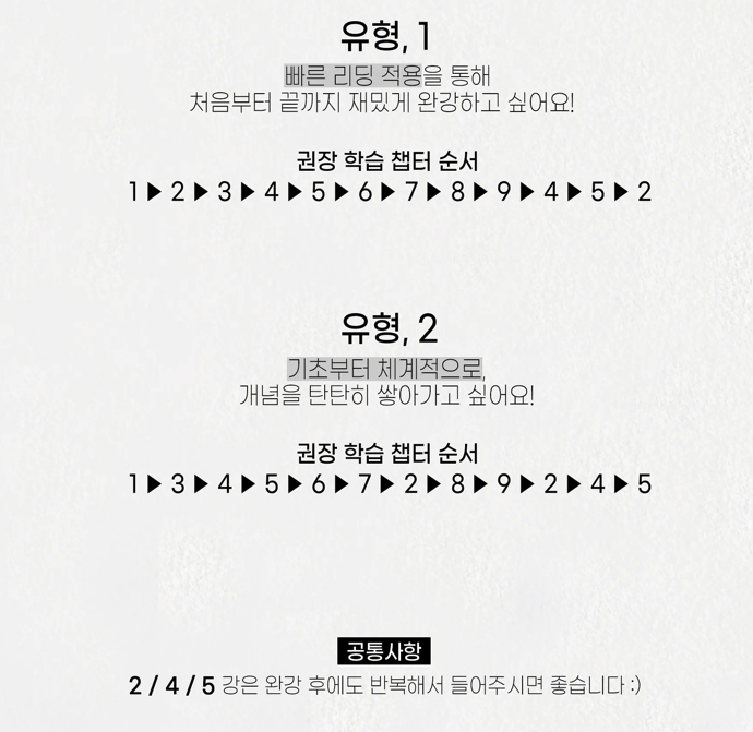 사실 공부로만 끝나면 아쉬울텐데, 마지막에 강의를 어떻게 활용하면 좋은지를 한꺼번에 정리해주는 점도 좋았습니다. 그리고 어떻게 반복적으로 강의를 보면 좋은지도 알려주셔서, 공부하는데 있어서 내가 편한 방식으로 강의를 듣고 반복해서 내꺼로 만들면 됩니다.