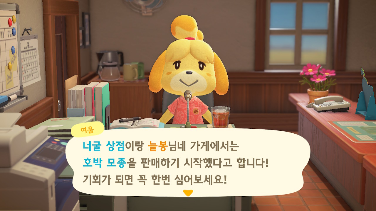 - 게임을 시작하면 여울이가 할로윈 시즌이라면서 설명을 해줍니다. 새롭게 추가된 아이템으로 "호박"이 등장합니다! 호박으로 다양한 DIY 가구를 만들수 있다고 하네요. 호박모종은 1.너굴 상점 또는 2. 늘봉이 가게 에서 구매가 가능하도 합니다. 그리고 너굴상점에서는 사탕을 판다고 안내해주네요.