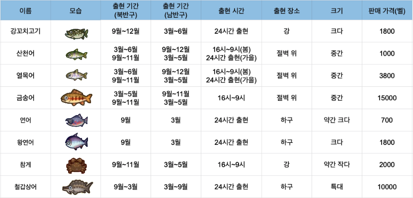 - 총 8마리의 새로운 물고기를 9월달 부터 만날 수 있어요! 이 중에 연어, 왕연어 두 종류는 9월만 잡을 수 있으니!! 미리 잡아두세요! 전부 민물고기로 바닷물고기는 없으니 강가나 절벽을 노리시면 될것 같습니다.