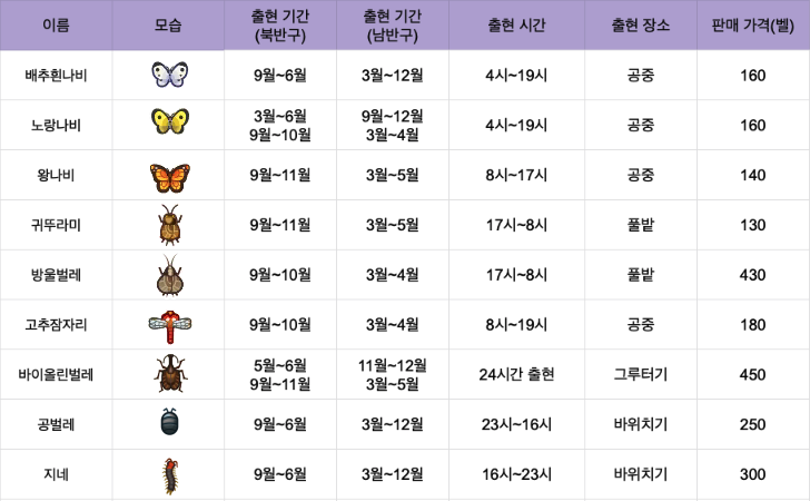 이번 9월달만 등장하는 곤충들은 없습니다. 그리고 대부분 봄에도 한번씩 등장했던 벌레들이라 이미 잡으신 분들도 계실꺼에요. 9월부터만 보이는 벌레로는 왕나비, 귀뚜라미, 방울벌레, 고추잠자리 총 4종류입니다. 딱히 판매가격이 높지 않은터라, 곤충채집대회용이나 수집용 정도로 모으시면 될것 같네요. 편하게 즐기시면 되실것 같습니다.