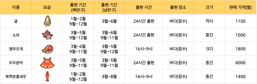 - 해산물은 총 5종이 9월 부터 잠수를 통해서 획득할 수 있습니다.