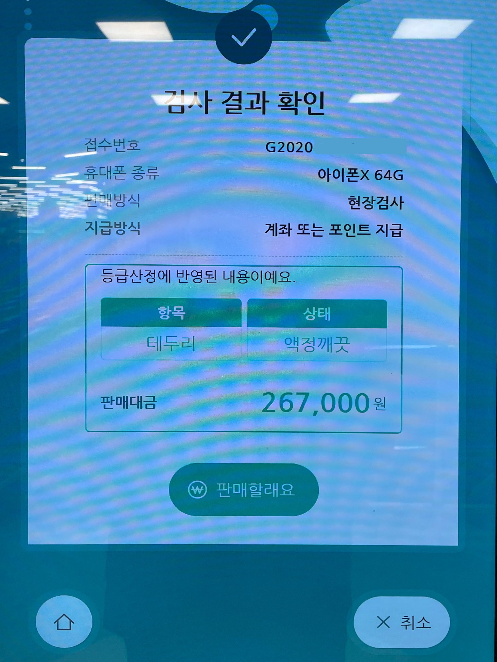 제가 가진 아이폰X의 경우 케이스를 씌웠지만 하단하고 상단이 노출되는 케이스라서 쓰다보니 하단 테두리 부분에 자연스럽게 기스가 나있었습니다. 그래서, 민팃 홈페이지에서 시세를 봤을때 A등급 기준이였어요. 실제로 민팃에서도 4단계에 걸친 진단결과 A급으로 판단되었습니다. 액정상태는 깨끗한데 차감 항목으로 테두리가 나왔죠 ㅠ-ㅠ