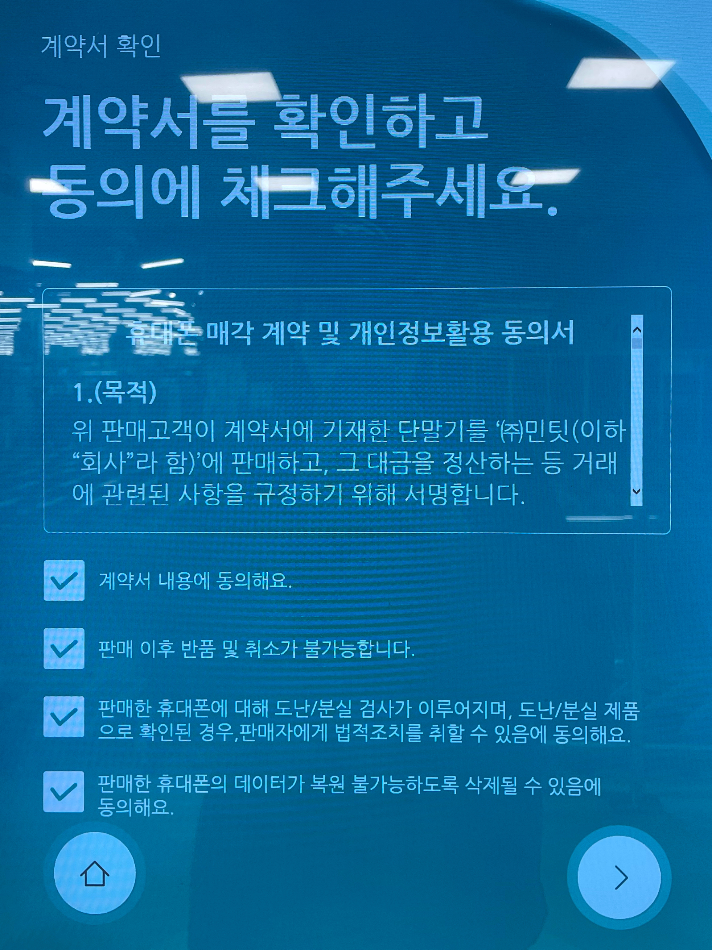 그래서 와 정확하다라고 생각해서 반박이 불가했습니다. 여기서 판단이 맘에 안드신 경우에는 취소를 누르시고 다시 폰을 가져가실 수 있으니 이때 결정하시면 됩니다. 이상이 없으시면 정산버튼을 누르시고 계약서 작성 후 정산을 받으시면 됩니다. 계좌나 민팃 포인트가 있지만 무조건 현금이죠!! 정산은 카카오톡으로 문자가 오며 계좌번호를 입력하면 당일 내로 정산입금이 됩니다. (저는 입력 후 입금까지 5분정도 걸렸어요)