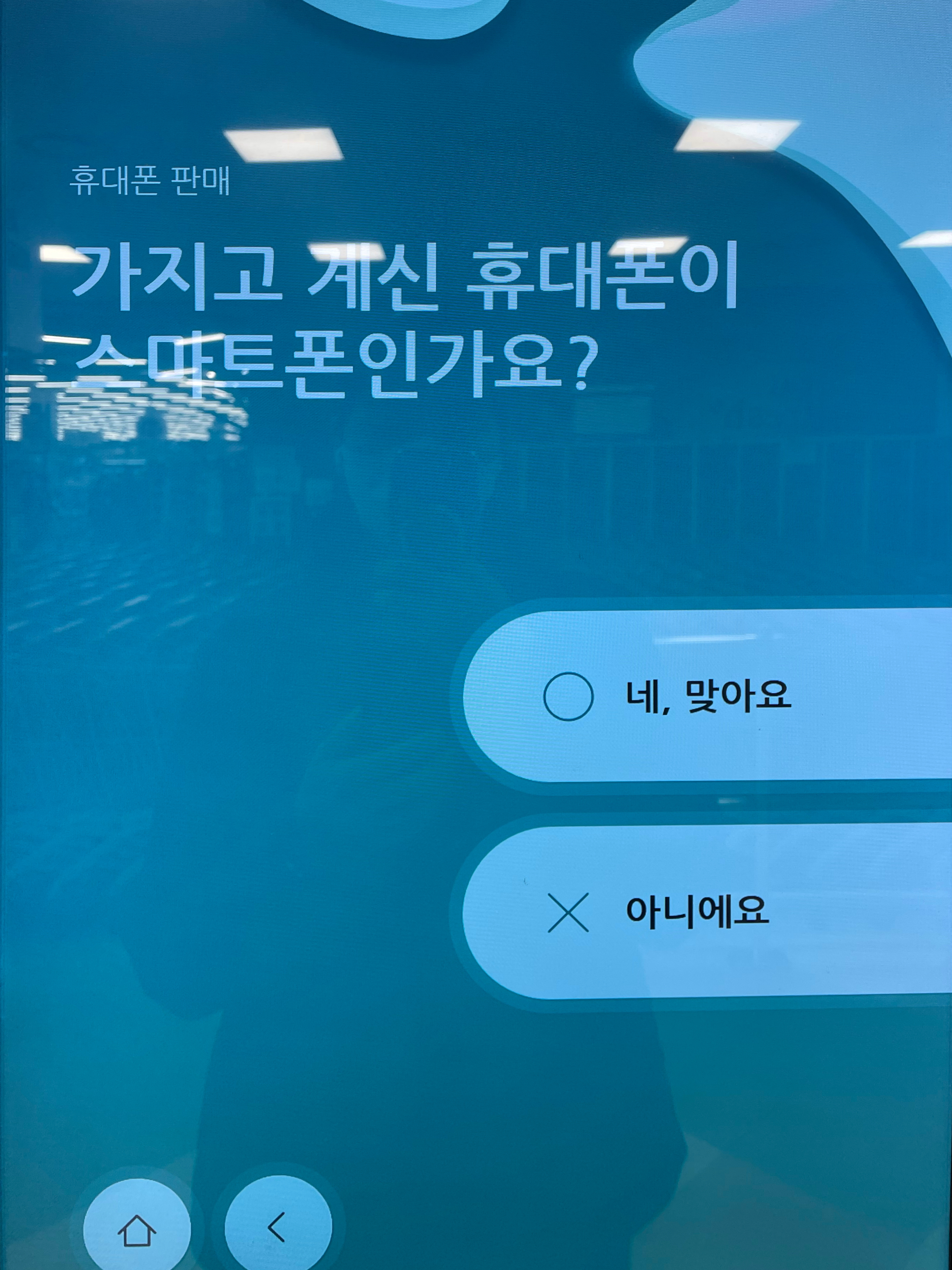 먼저 본인인증을 받을 핸드폰 번호를 입력하면, 카톡으로 인증문자가 나옵니다. 그 인증을 마치시고 판매할 휴대폰이 스마트폰인지 체크를 하고 현장 검사를 받을지 확인을 하는데요. 최근 판매되고있는 아이폰이나 갤럭시와 같은 폰들은 그냥 판매가 가능하고, 오래된 기종이나 해외폰들은 현장검사가 불가하다고 하네요. 물론 이경우도 판매가 아예 안되는것이 아니라 수거 후 검사가 진행된다고 합니다.