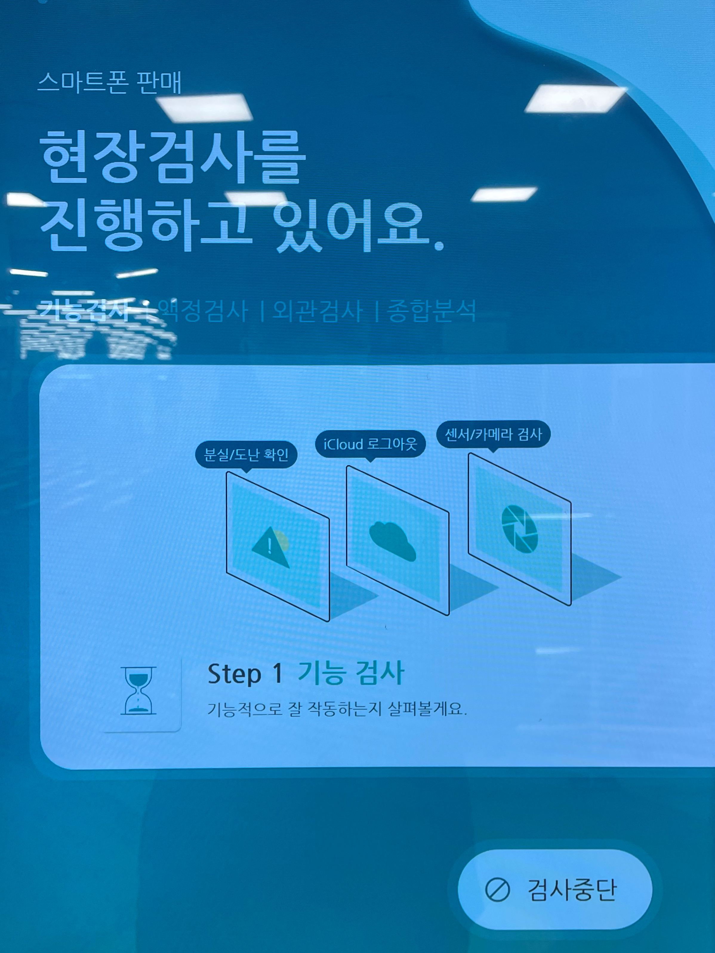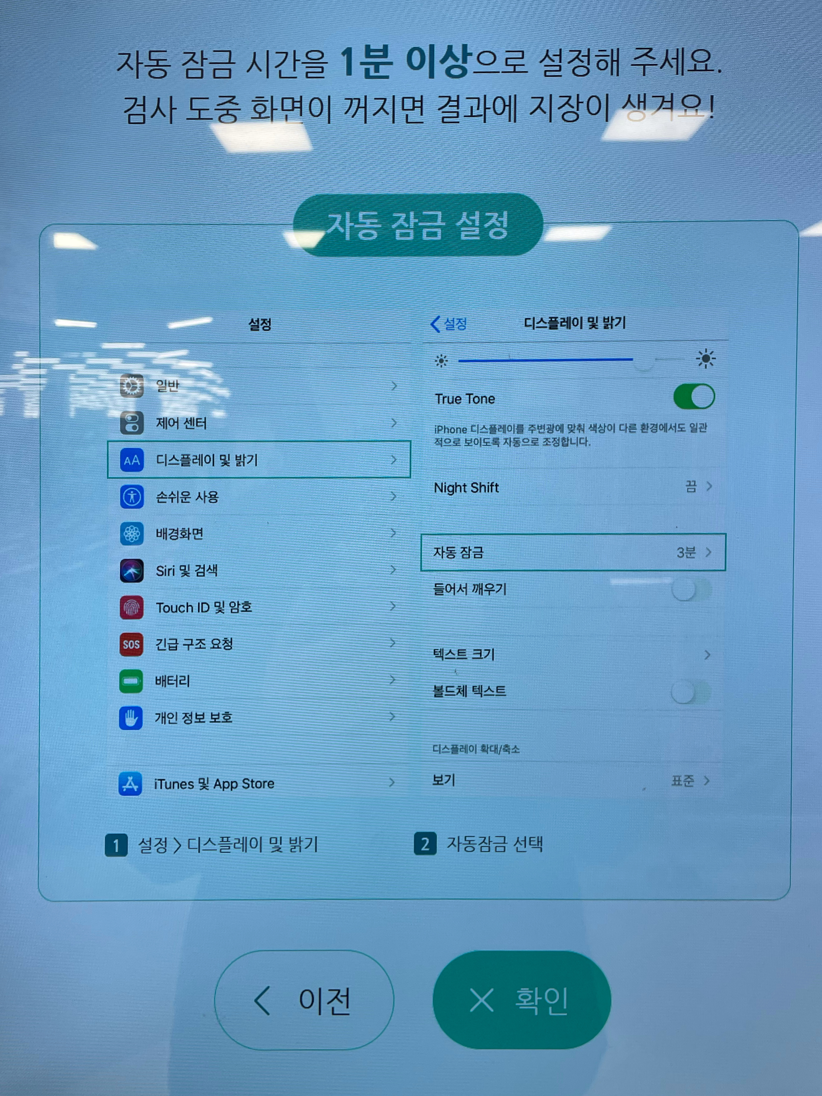 그러고 난 다음 OS 형태를 묻는데요, 아이폰은 iOS 그리고 갤럭시나 LG폰등은 안드로이드를 선택해주시면 됩니다. 저는 아이폰X라서 iOS를 선택하였습니다. 여기서부터 진단을 위해서 간단한 셋팅이 필요합니다. 먼저 화면이 꺼지지 않도록 자동잠금시간을 1분 이상 설정하고, iCloud 계정 로그아웃을 합니다. 그런다음 접수를 위한 스티커가 발행되는데요. 이 스티커를 핸드폰 후면에 부착해줍니다.