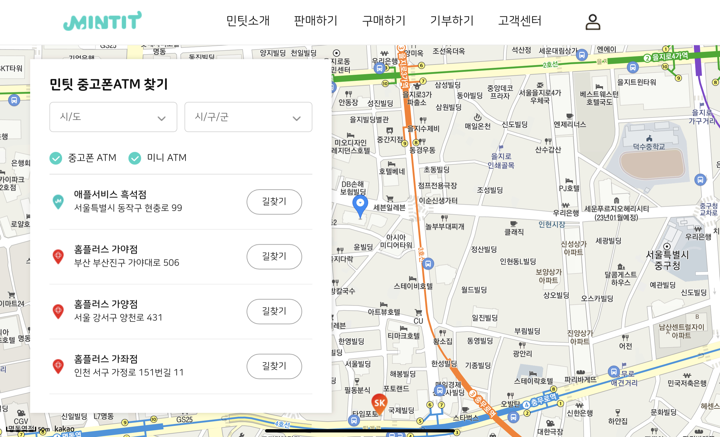 민팃 홈페이지(mintit.co.kr)에서 중고폰ATM 찾기에 가시면 본인지역 근처 가까운 곳에 매장을 검색해줍니다. 진짜 ATM처럼 기계만 달랑있어서, 남의 눈치 볼필요없이 거래가 가능하다는게 좋은것 같아요! 위에 오른쪽 사진이 저희 집 근처 홈플러스 매장에 있는 민팃ATM 기계입니다.