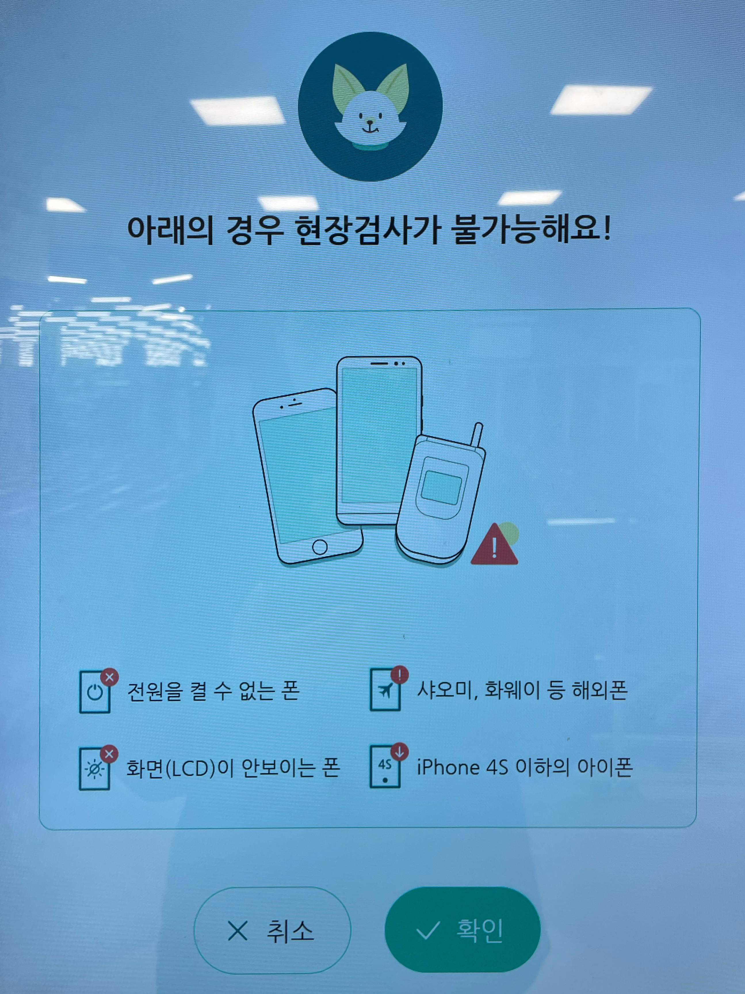 먼저 본인인증을 받을 핸드폰 번호를 입력하면, 카톡으로 인증문자가 나옵니다. 그 인증을 마치시고 판매할 휴대폰이 스마트폰인지 체크를 하고 현장 검사를 받을지 확인을 하는데요. 최근 판매되고있는 아이폰이나 갤럭시와 같은 폰들은 그냥 판매가 가능하고, 오래된 기종이나 해외폰들은 현장검사가 불가하다고 하네요. 물론 이경우도 판매가 아예 안되는것이 아니라 수거 후 검사가 진행된다고 합니다.