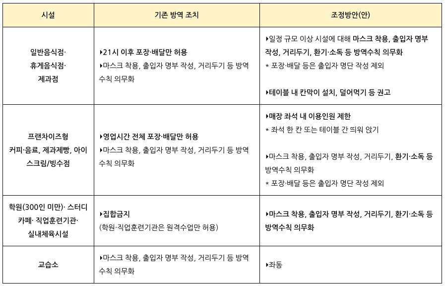 - 서민층 생업 시설을 직접적으로 제한하는 일부 방역 조치 조정