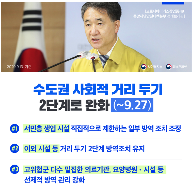 - 9/13부 사회적 거리두기 2.5단계에서 9/14부 2단계로 완화 조치 시행 (~9/27까지)