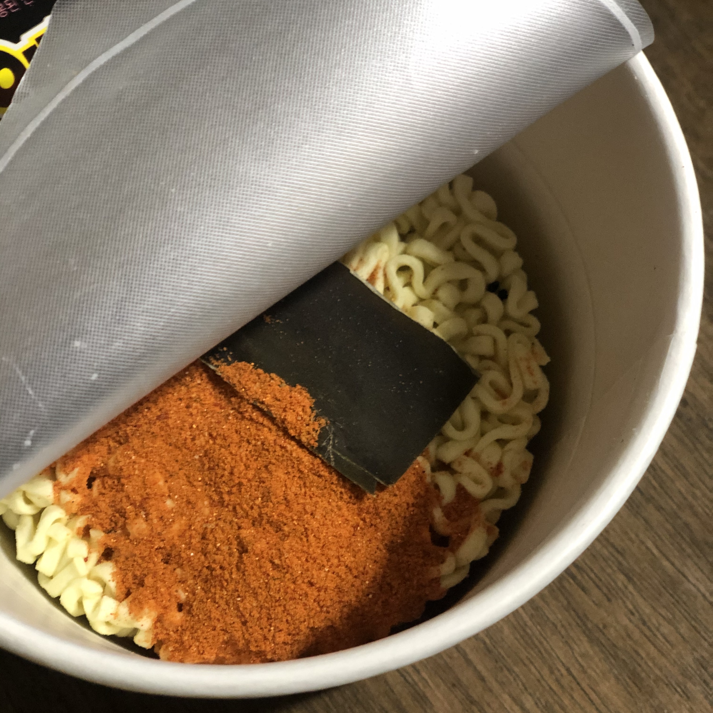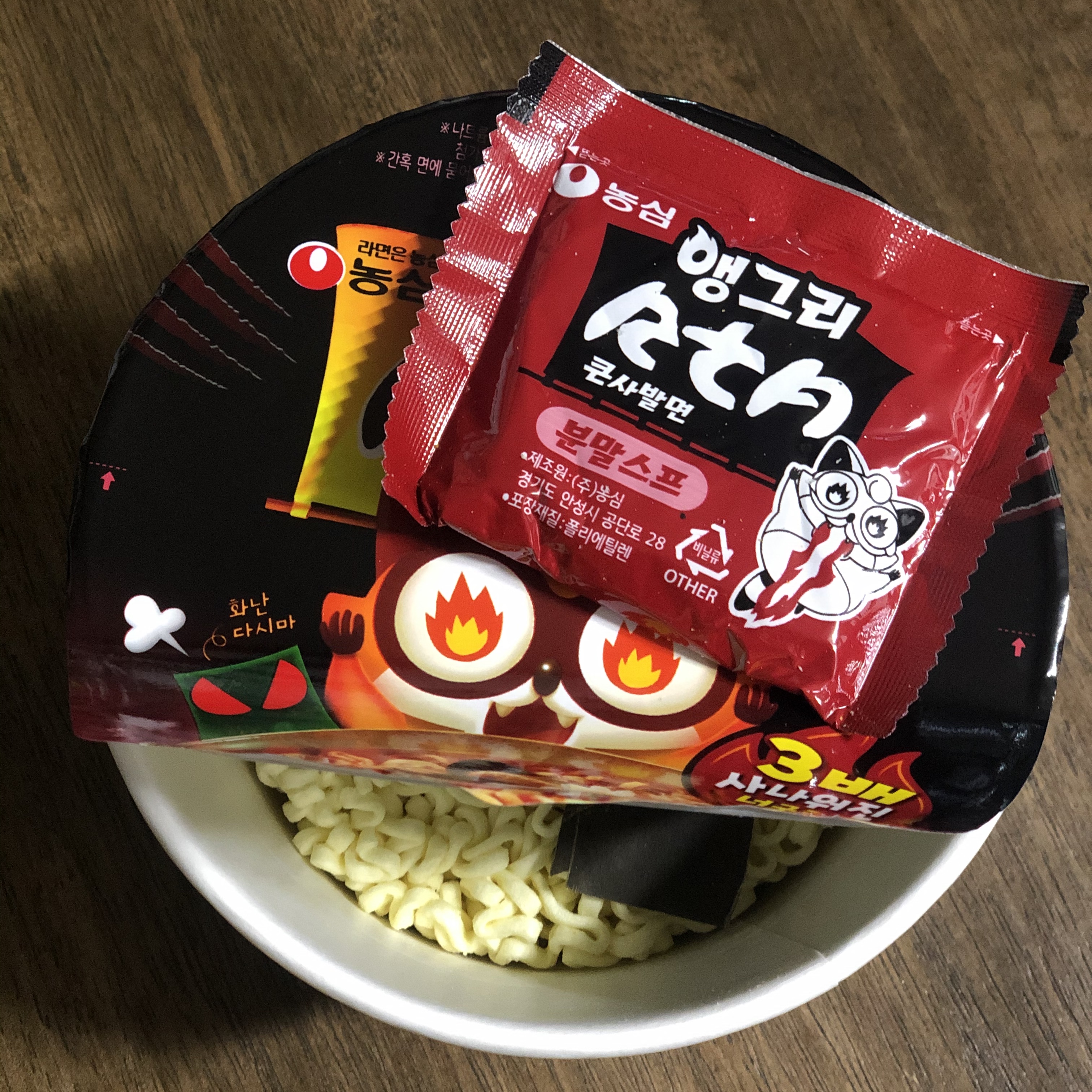 앵그리 RTA 컵라면 버전의 내용물은 심플합니다. 원래 내용물(면, 다시마, 건더기)에 분말스프만 따로 포장 되어 있습니다!