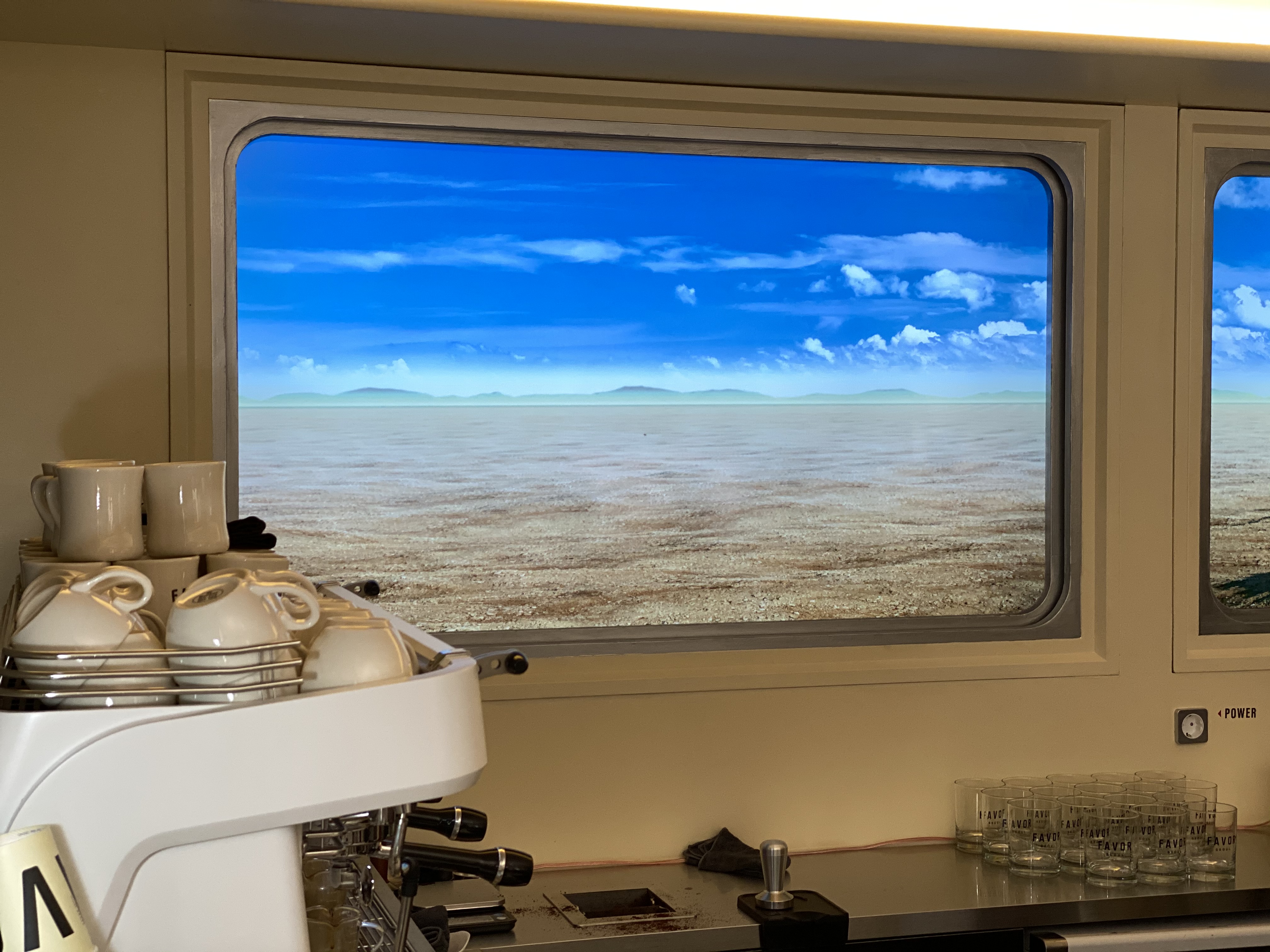 그리고 매장 바 뒷편에는 대형 스크린이 3개 설치되어 있는데, 이곳에서 마치 기차를 타고 가는듯한 풍경 영상이 펼쳐집니다.