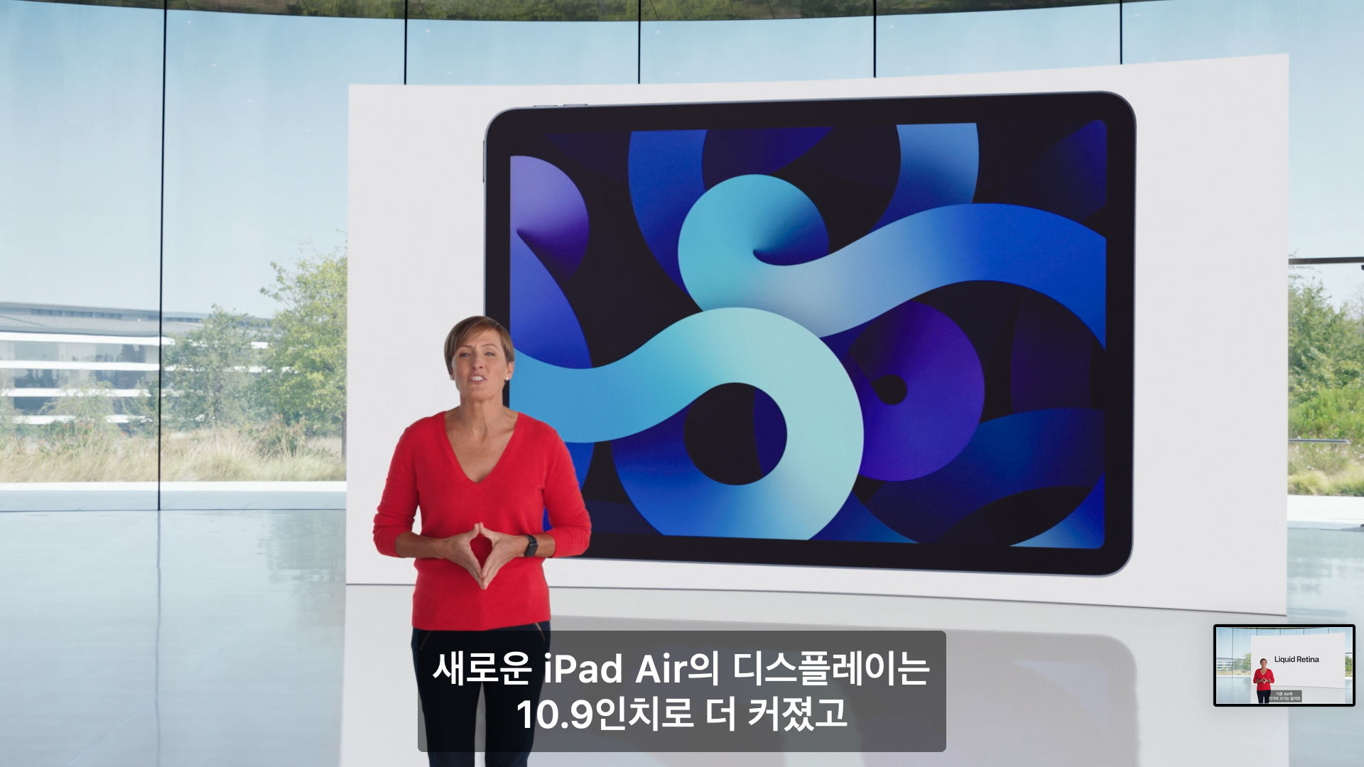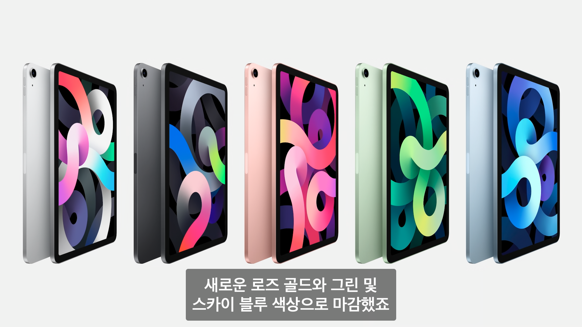 - 이번 발표의 꽃이죠. 달라진 아이패드 에어입니다. 에어의 디자인 자체가 아이패드 프로의 디자인과 동일하게 각진 디자인으로 바뀌었습니다.