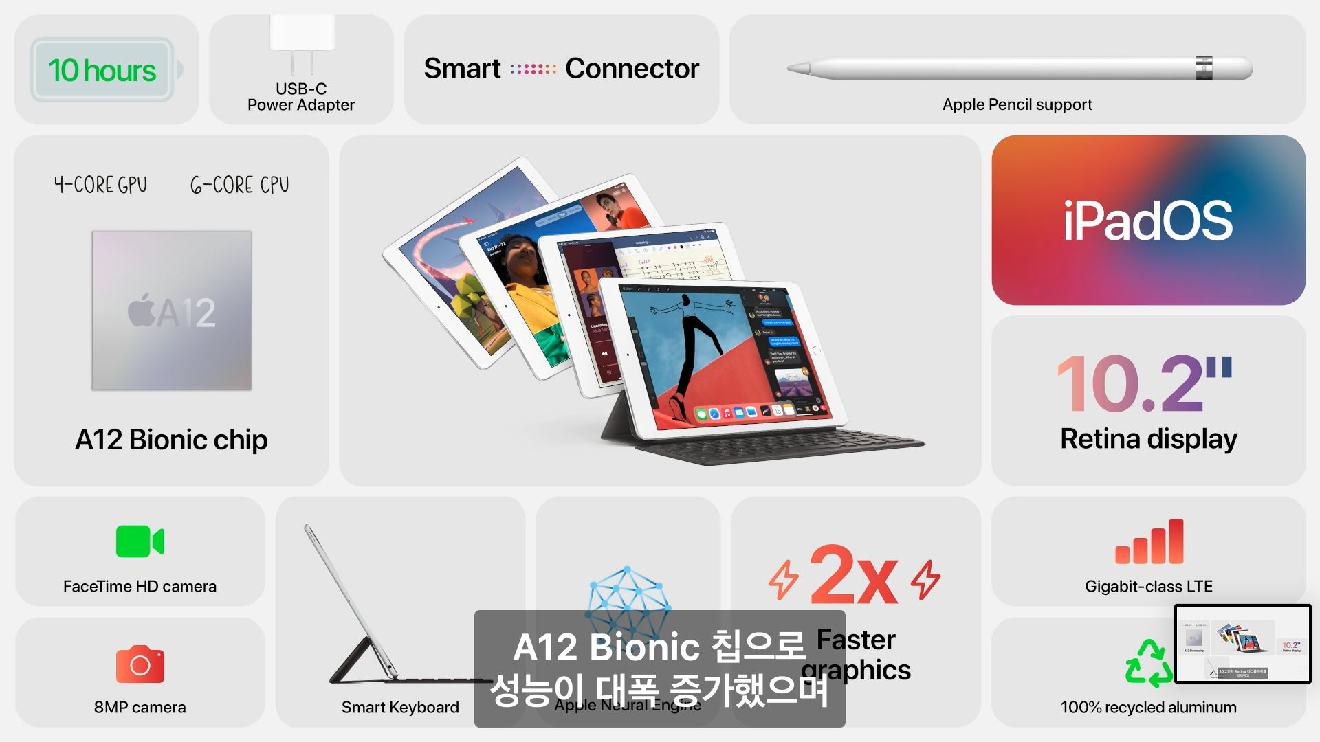 - 사실 크게 달라진점은 A12 바이오닉 칩셋을 도입하여 40% 빨라진 처리속도, 2배 빨라진 그래픽입니다 이 외는 iPadOS 업데이트를 통한 기능이 강화된 점인데요. 이 외 이전 세대에서 제공되었던 기본적인 기능들은 비슷합니다.