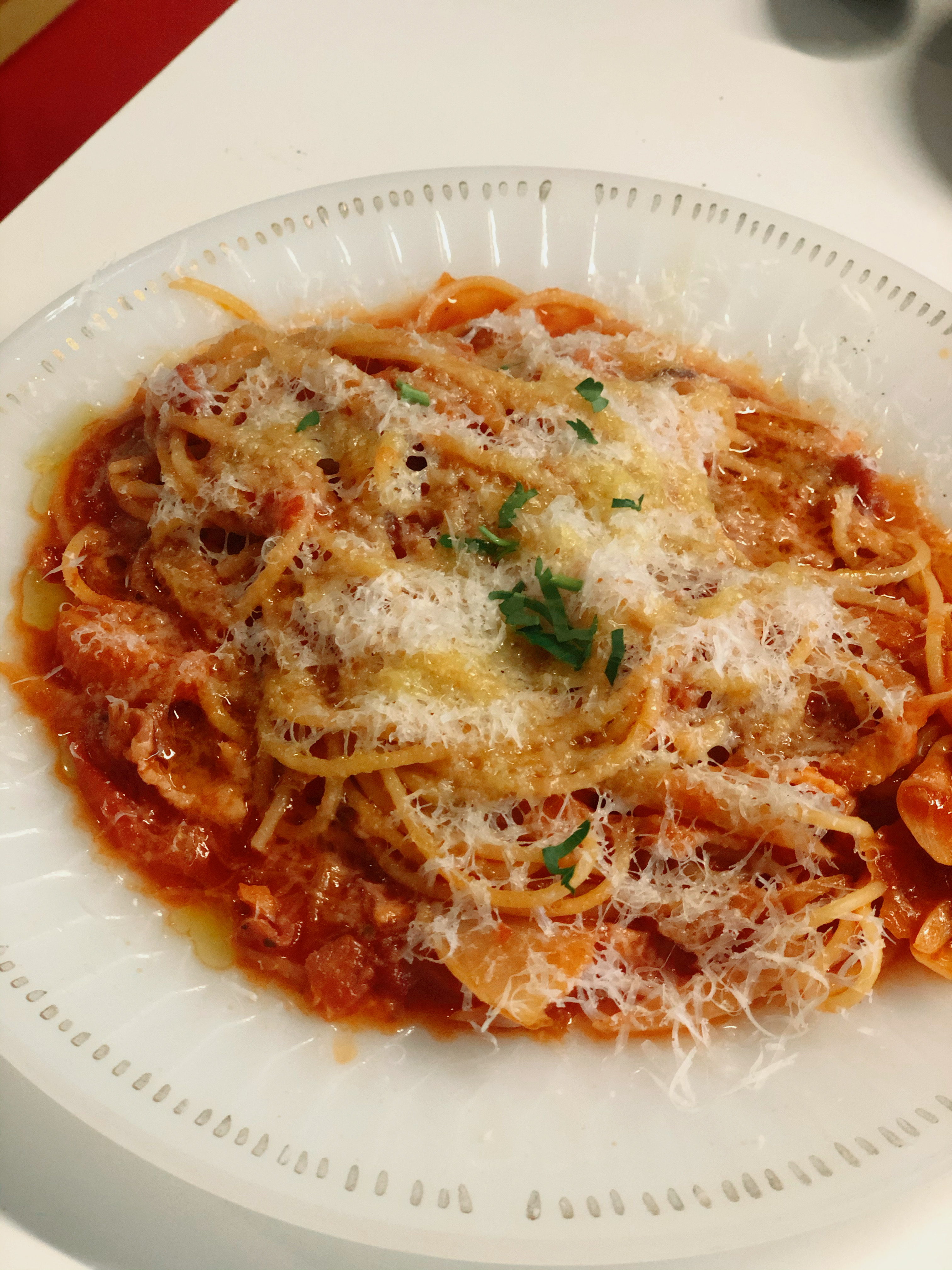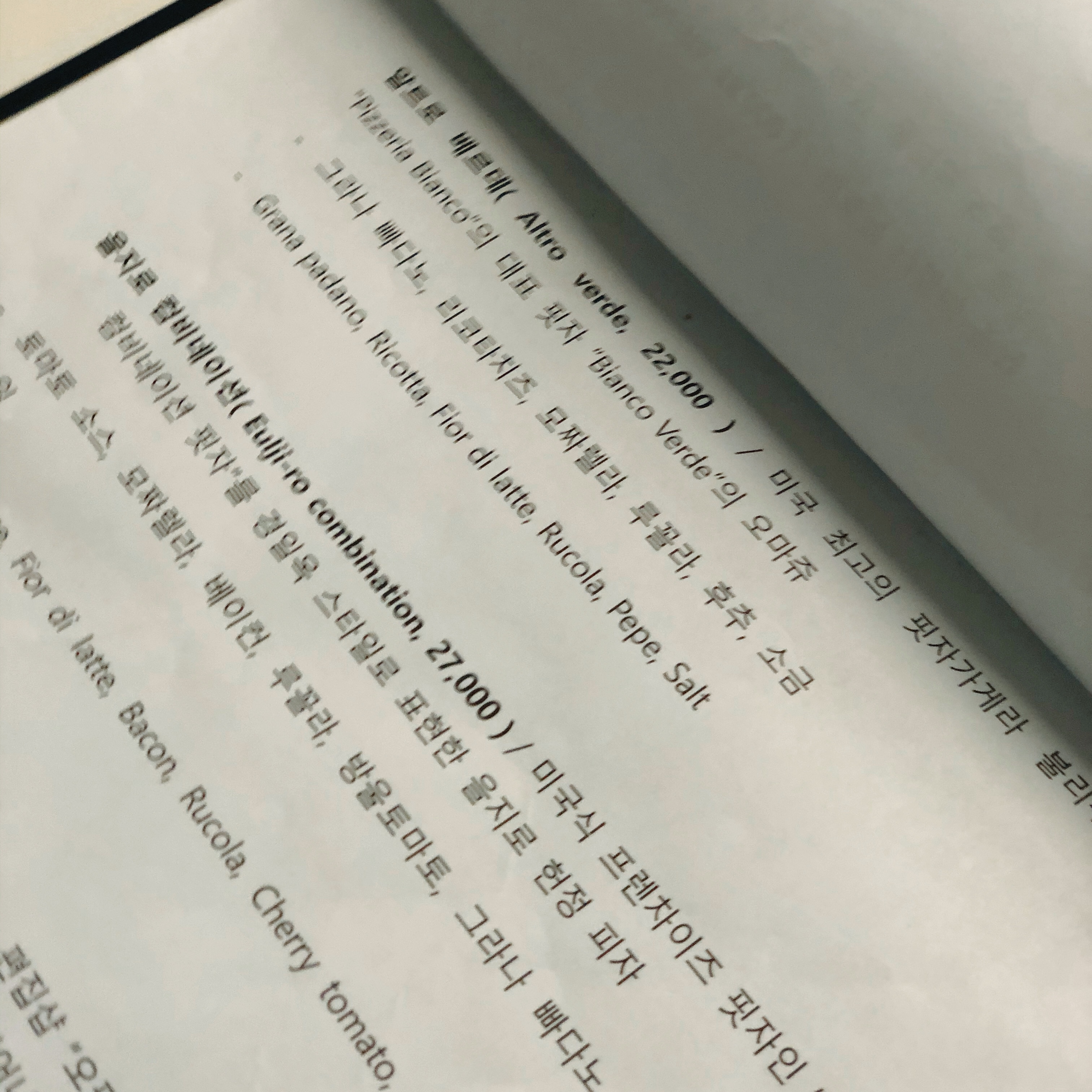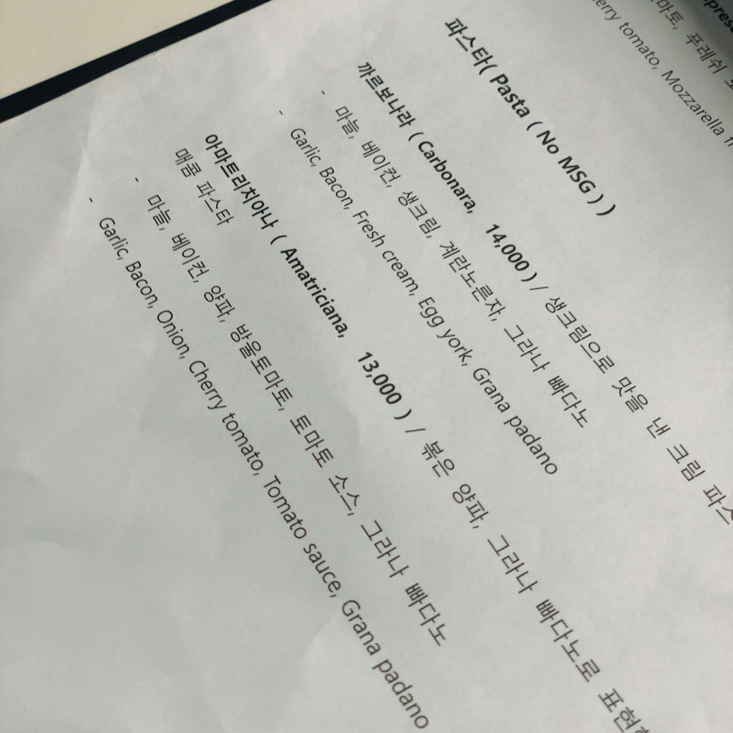우리는 피자 “알트로 베르데” 와 파스타 “아마트리치아나” 를 주문. 사실 처음이고 사전의 메뉴를 검색하지 않았던터라 직감적으로 시켰다