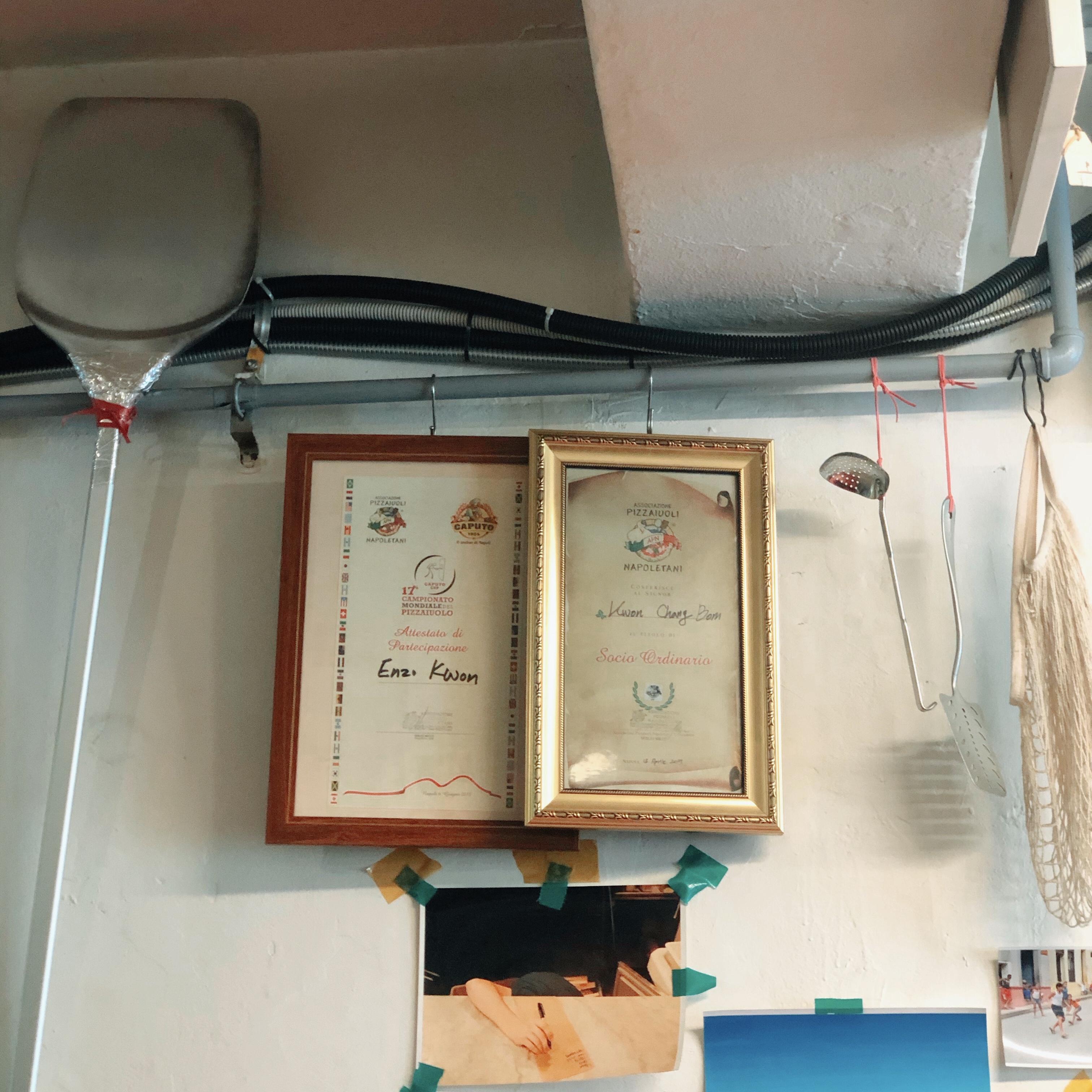 벽에 걸린 자격증?! 인증서 같은게 보인다. 뭔가 피자 장인 같은 그런것같았다. 굳이 이게 없더라도 이미 맛보면서 맛있는 피자란걸 알았지만 저걸 보니 한 번더 믿고 먹게 되는거다