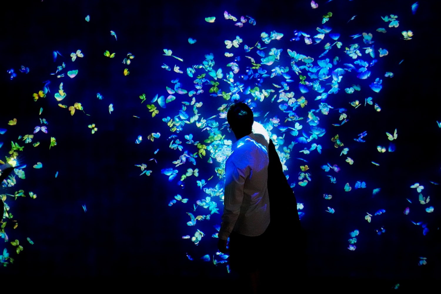 - 즉, 팀랩의 전시회는 인터렉티브한 디지털미디어 아트로써 관람객이 손으로 만지거나 움직임에 따라서 그 작품이 반응을 합니다. 예를 들어 아래의 '경계를 초월한 나비 떼, 경계 너머 태어나는 생명' 작품 경우 손으로 나비를 만지면 나비가 떨어집니다. 이 모습은 의도한 것으로 작품의 설명을 듣고 보시면 정말 신기한 경험을 하실 수 있습니다. 자세한건 영상/포토존에서 좀더 말씀 드릴께요