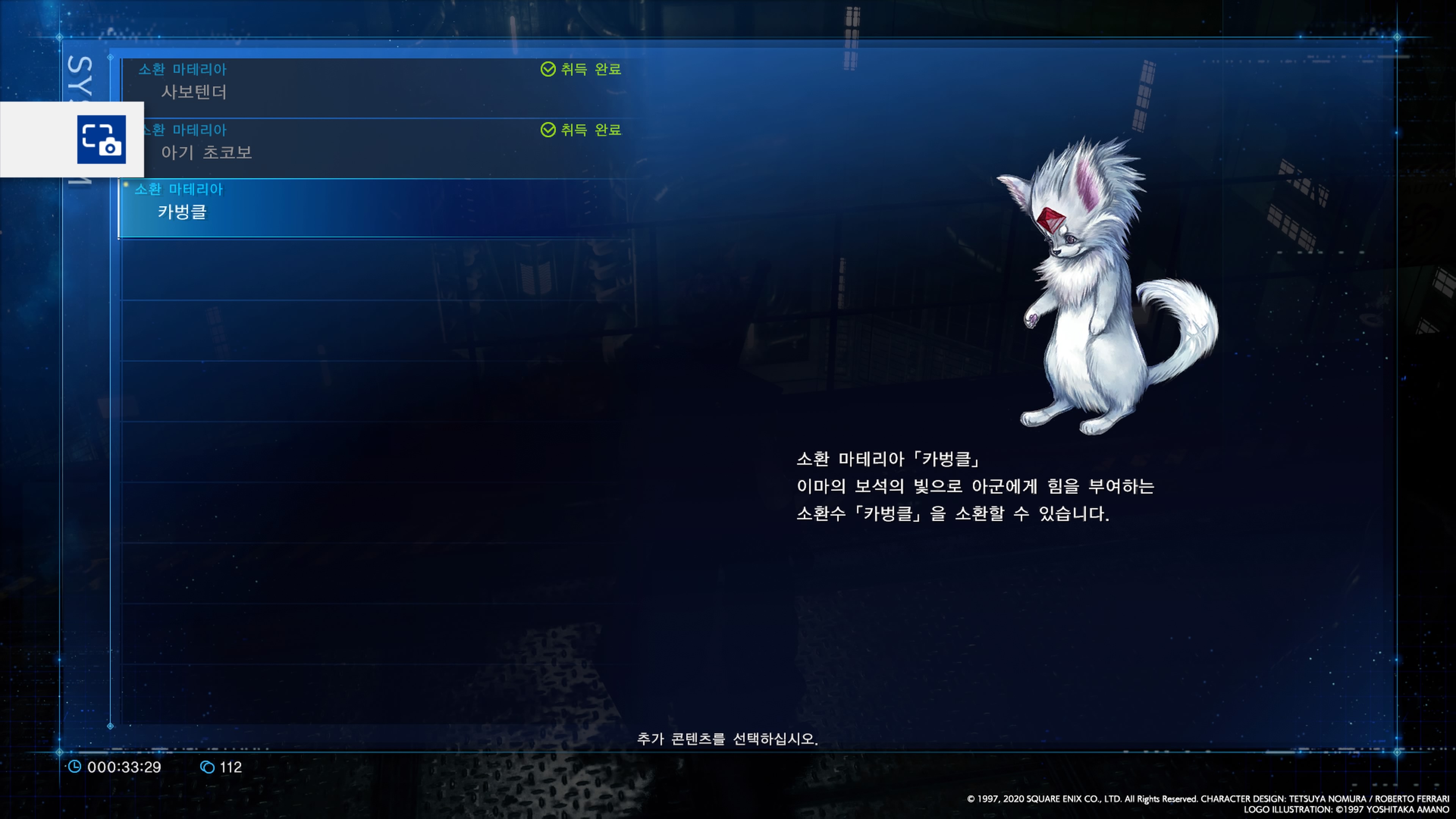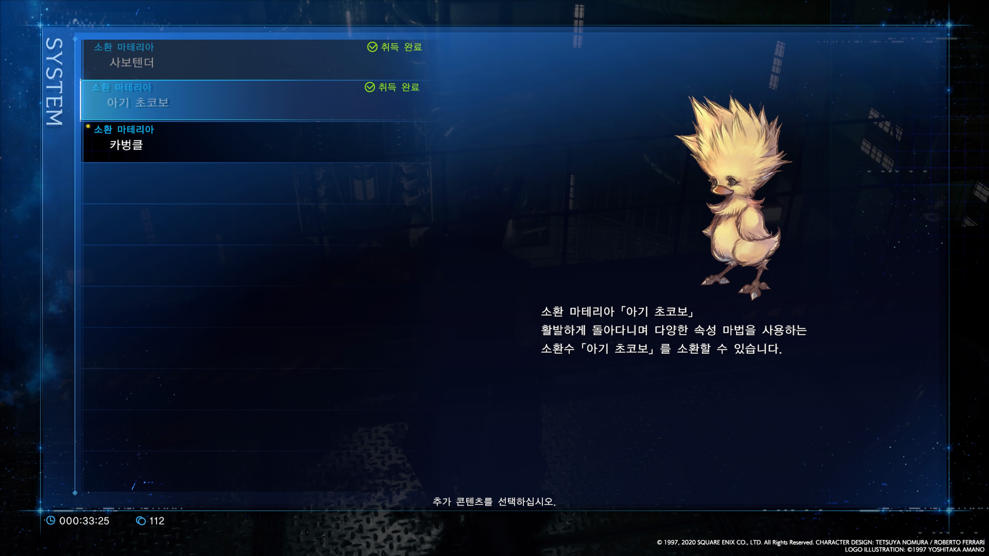 또한 이곳에 시스템 메뉴에서는 디럭스 에디션 특전인 소환수 3종(사보텐더, 아기 초코보, 카벙클) 마테리아 입수가 가능합니다.