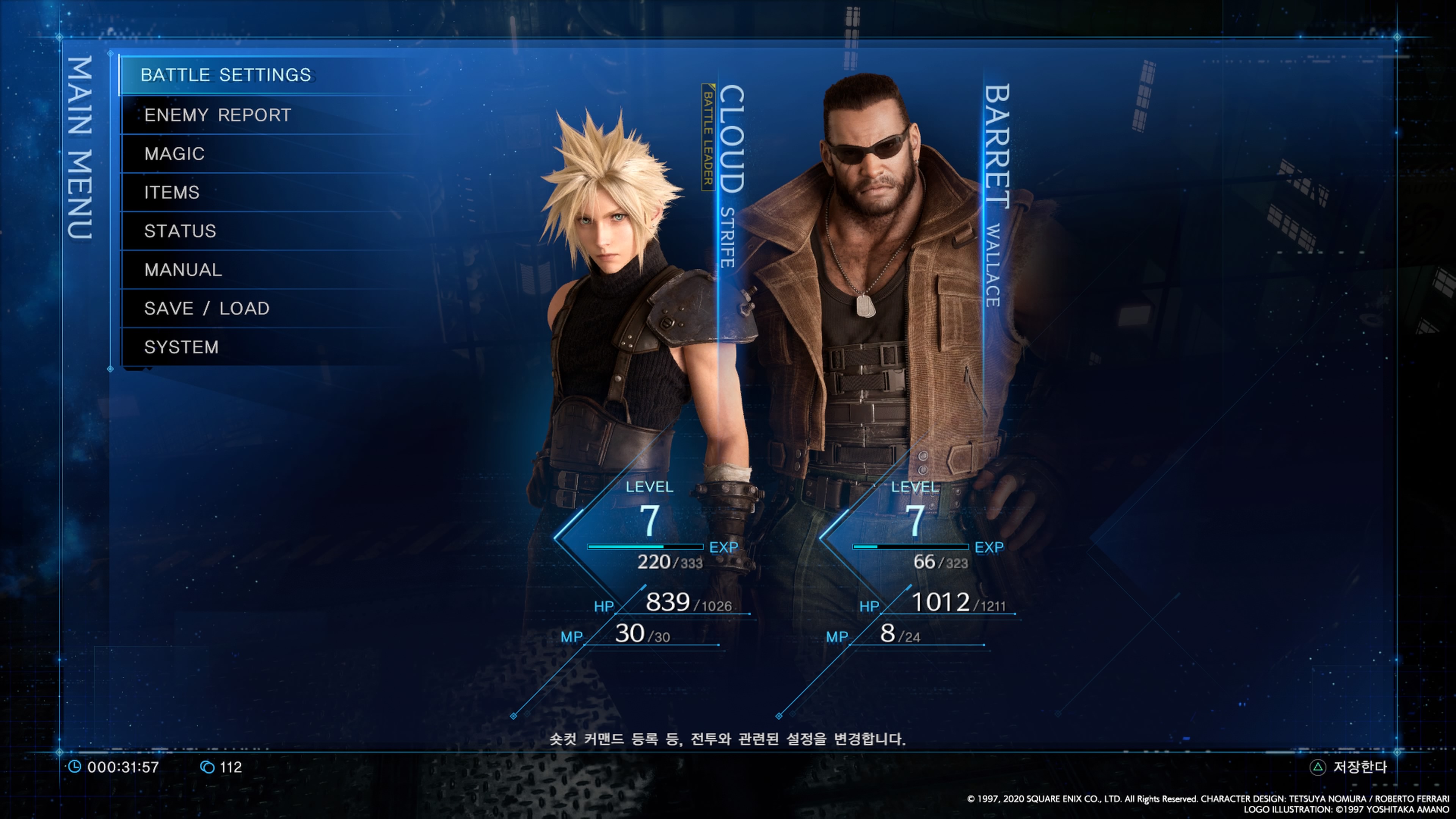 이런 요소들이 한가득인 파판7입니다. 여기까지 약 2시간의 플레이 타임이고 계속 플레이중이라서