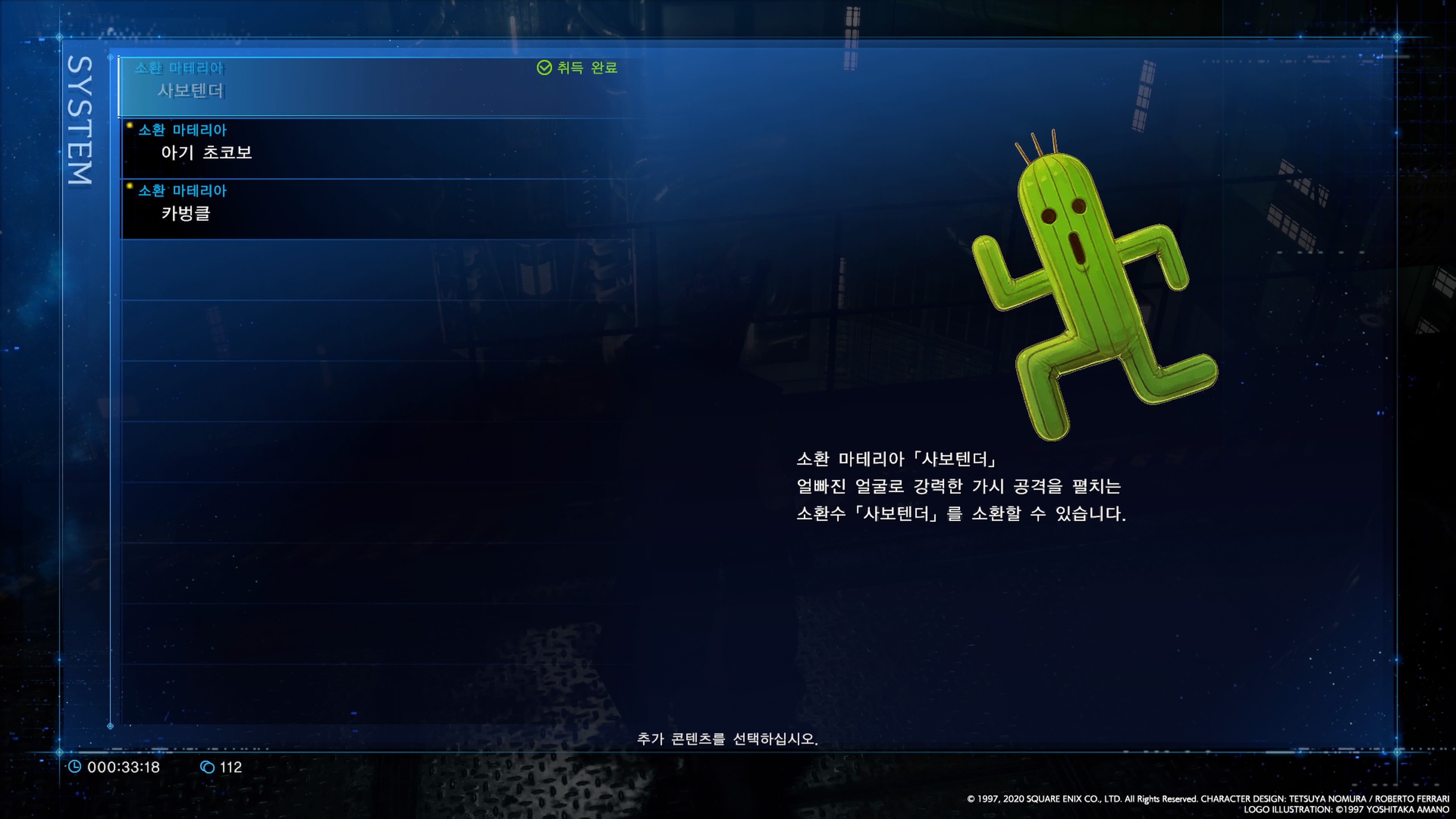 또한 이곳에 시스템 메뉴에서는 디럭스 에디션 특전인 소환수 3종(사보텐더, 아기 초코보, 카벙클) 마테리아 입수가 가능합니다.