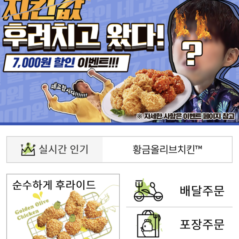 - 황금올리브 치킨 18,000원짜리 제품을 주문하면 됩니다.