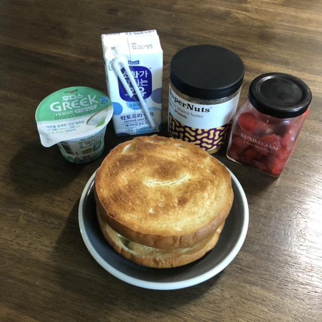 베이글 + 피넛버터 + 스트로베리잼 + 무가당그릭요거트 입니다!