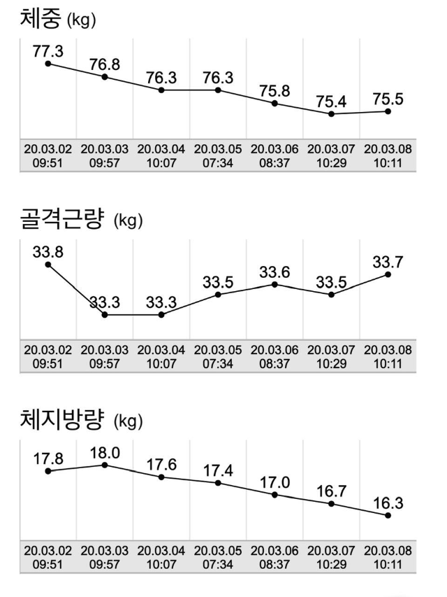 전일대비: 체중 +0.1kg / 근육량 +0.2kg / 체지방 -0.4kg