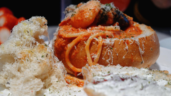 그리고 나온 빠네파스타 ! 토마토베이스의 홍합과 새우가 들어간 파스타로 바게트볼을 가득 채워서 주셨다