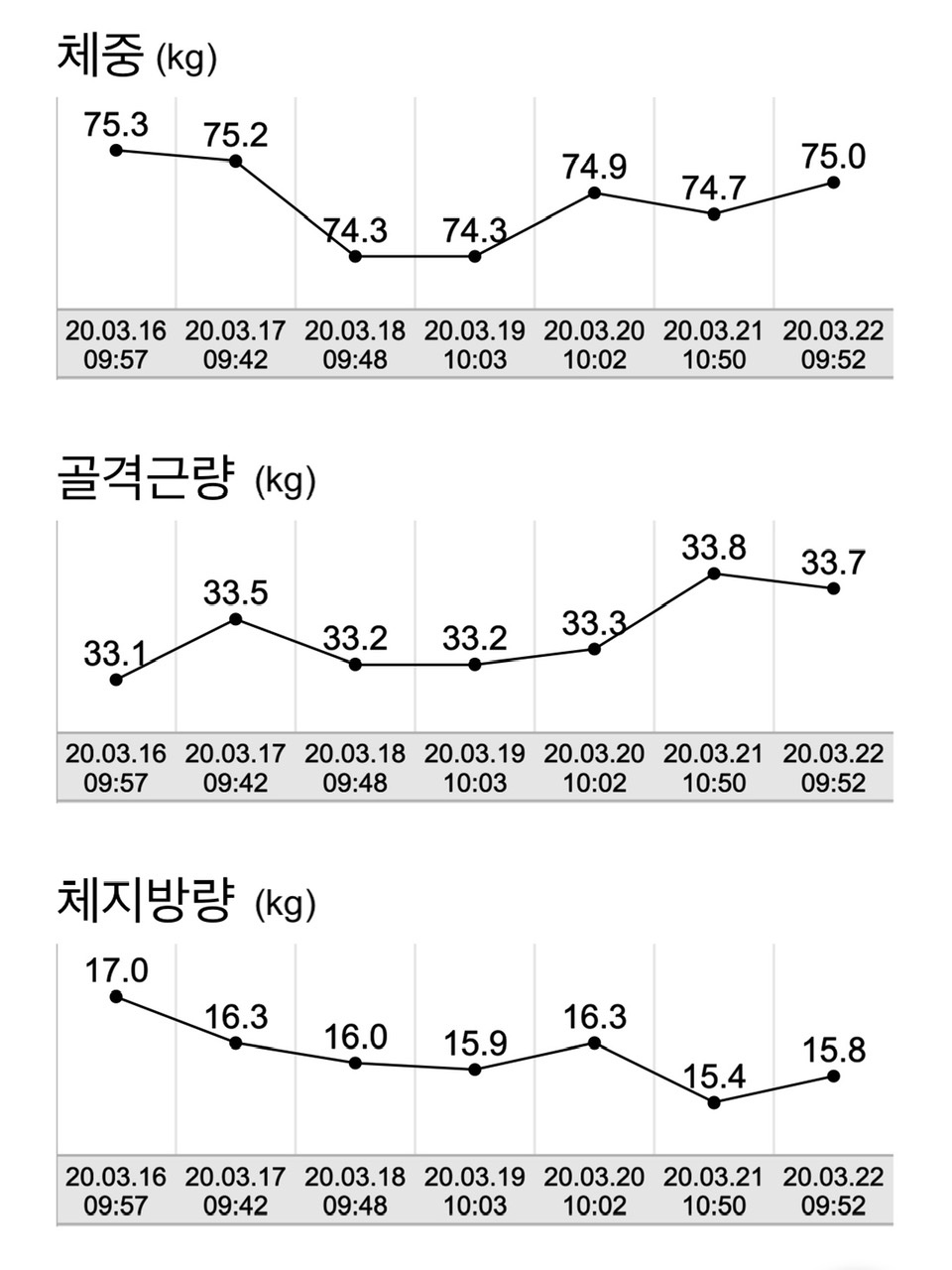 전주대비: 체중 -0.5kg / 근육량 -0.1kg / 체지방 -0.4kg