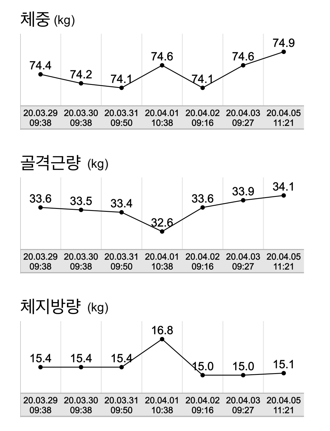 하지만, 수치상으론 체중외에 근육과 지방량은 줄어서 다행인데, 이게 시간차로 월요일날 팍 오를것 같아 ㅠ